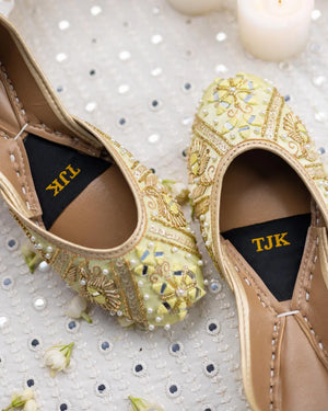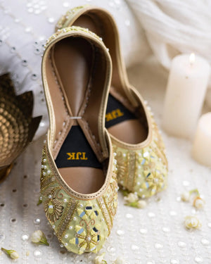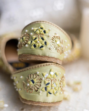 A pastel green base adorned with golden threadwork, mirror details, and pearls, radiating joy and festivity. This khussa is perfect for mehendi or haldi ceremonies, adding a touch of brightness to your outfit.