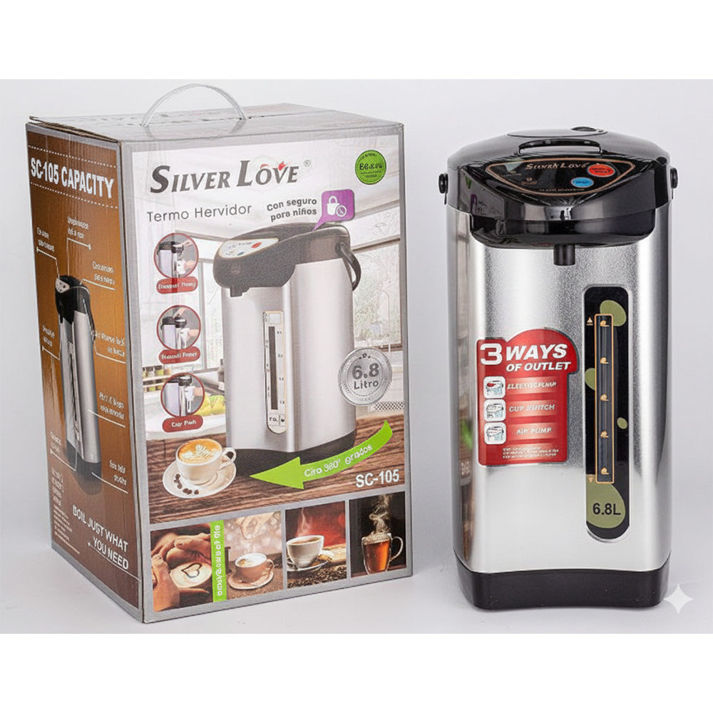 The Silver Love SC105 Thermo Pot is a premium imported stainless steel electric water dispenser with a 6.8‑liter capacity and 2000W heating power. Designed for homes, offices, and cafés, it ensures fast boiling, hygienic storage, and convenient dispensing with its 3‑way water outlet system.