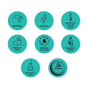 Natural, Organic, Artificial Color Free, Cruelty Free, Mineral Oil Free, Paraben Free, Sulphate Free, Halal