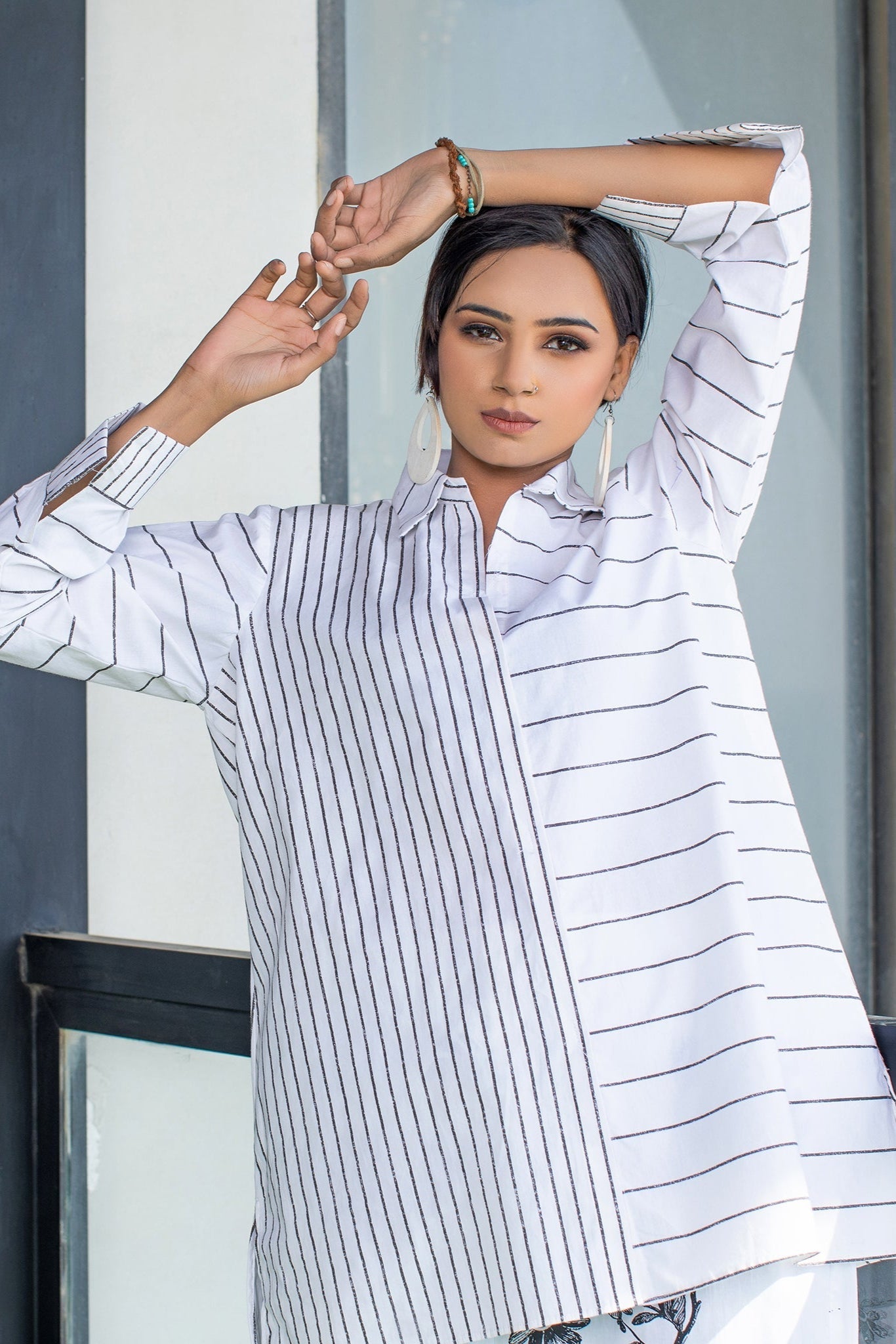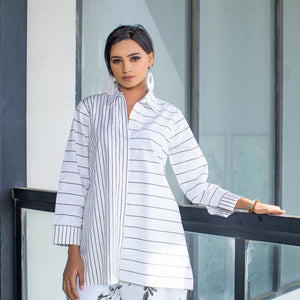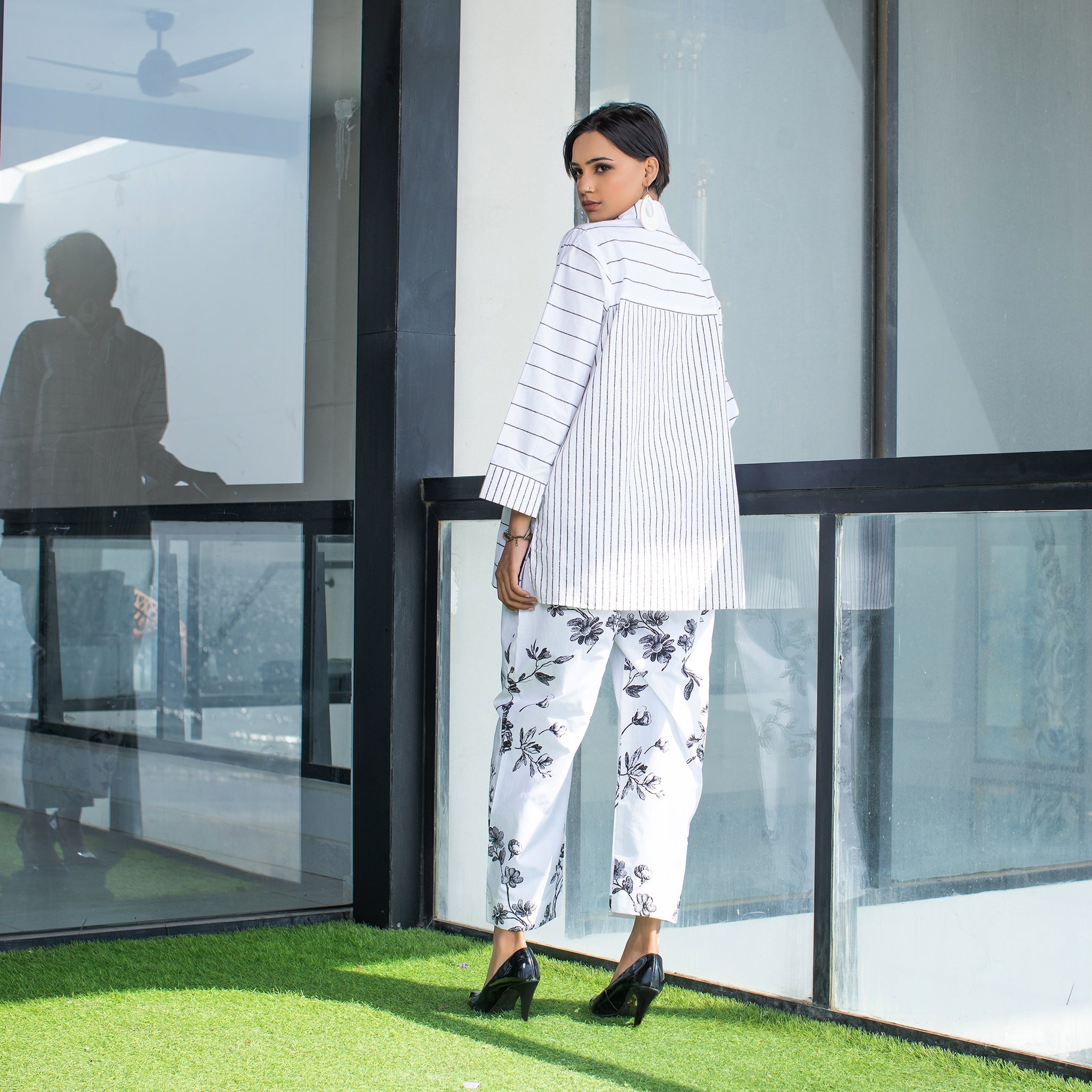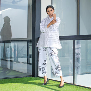 The co ord set begins with a Cotton Patch work at shirt with intricate small and big stripe while trouser in floral pattern. It's a versatile piece that can easily transit from casual to formal occasions with collar and cuff .