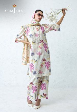 In a soft cream hue, this ensemble brings a breath of fresh elegance to your wardrobe. The printed shirt is adorned with a stunning tropical pattern, radiating charm. Paired seamlessly with coordinating printed trousers and a matching printed dupatta, this look offers a harmonious blend of style and sophistication, perfect for daytime outings or casual chic gatherings.