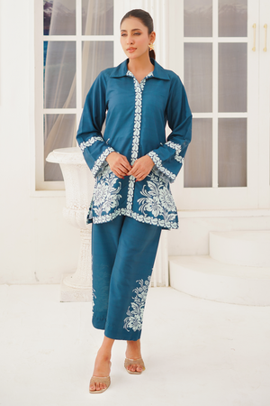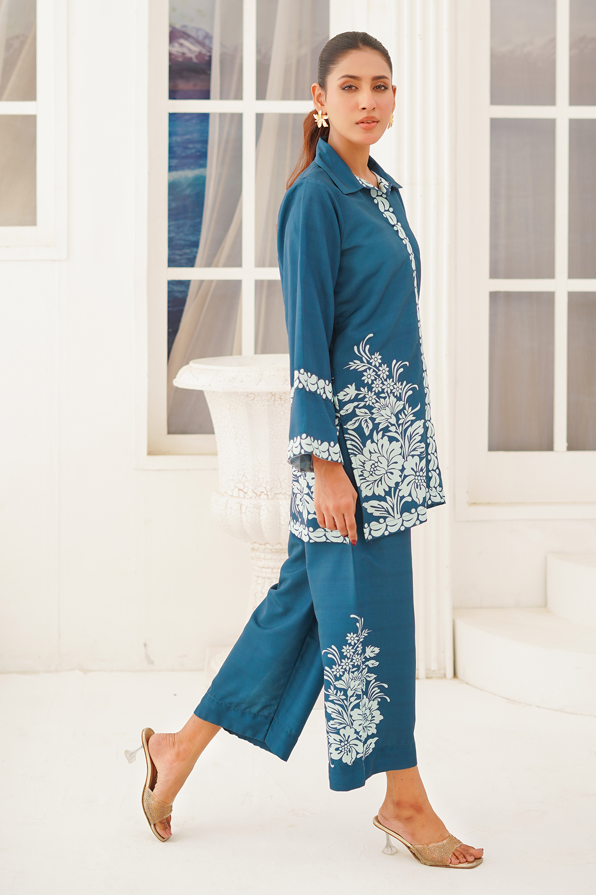 Nairah Stitched Co Ords Summer Suit-Teal Bloom
