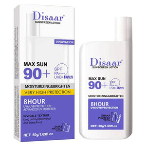 Disaar Sunscreen Lotion SPF 90+ Moisturizing & Brighten 50g contains an advanced UV Protector for your skin to shield against harmful UVA+UVB rays. Its invisible texture is long-lasting water-proof and sweat-proof.