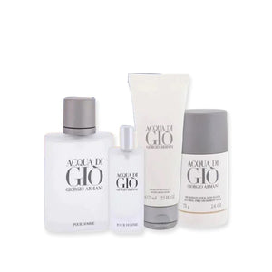 Discover the Acqua di Gio four-piece gift set. Acqua Di Gio Eau de Toilette is the iconic men's fragrance inspired by the pure warmth and freshness of the Mediterranean Sea. Acqua di Gio Eau de Toilette opens with a splash of fresh Calabrian bergamot, neroli, and green tangerine. Light, aquatic nuances mix with rosemary, sweet persimmon, and warm Indonesian patchouli to create a fresh-smelling fragrance for men.