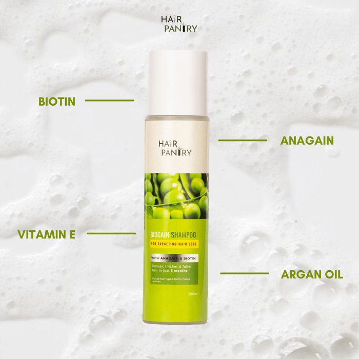 Hair Pantry’s Biogain shampoo is a blend of Anagain, Biotin, Argon Oil, and Vitamin E. Biogain is a rich creamy shampoo that gently cleanses & removes build-up helps to fight hair fall, strengthens and nourishes damaged hair while making your hair thicker, fuller & denser!