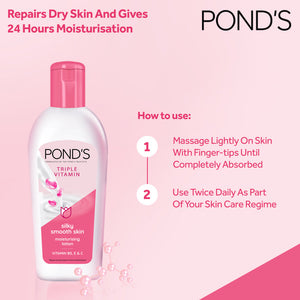 POND'S LOTION SILKY SMOOTH SKIN 100ML keeps your skin healthy and hydrated. This luxe moisturizing lotion helps to replenish and lock-in moisture for up to 24 hours, while restoring skin's clarity and softness. Our patented Moisture Nourishing Complex helps to support skin's natural protective barrier. Enjoy velvety, luxuriously smooth skin.
