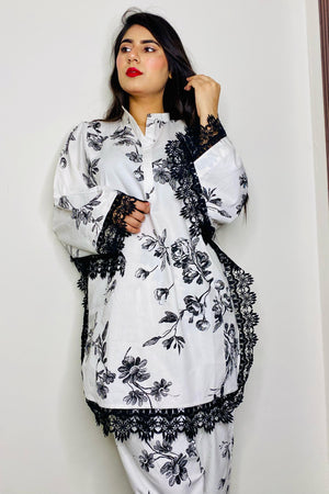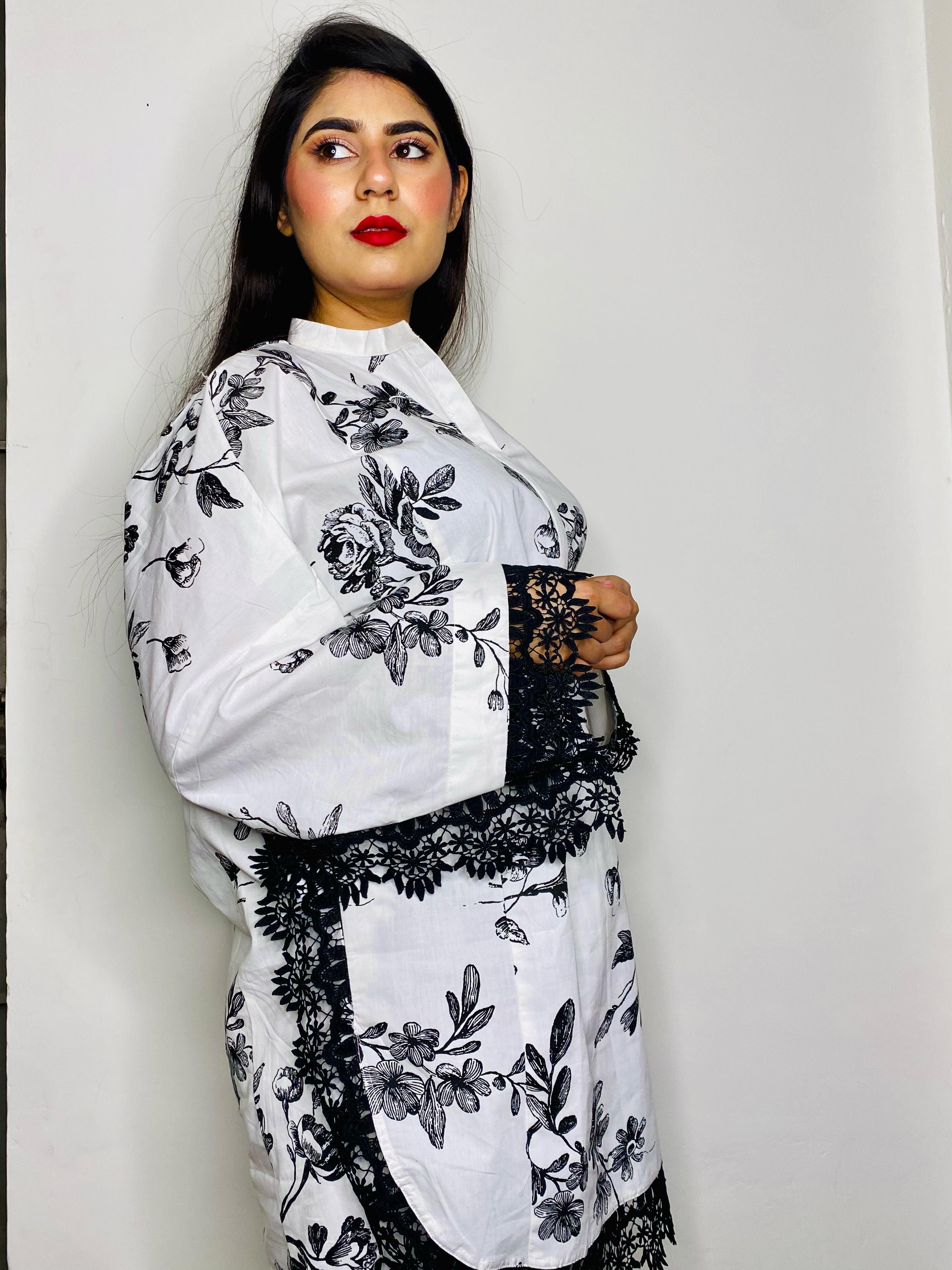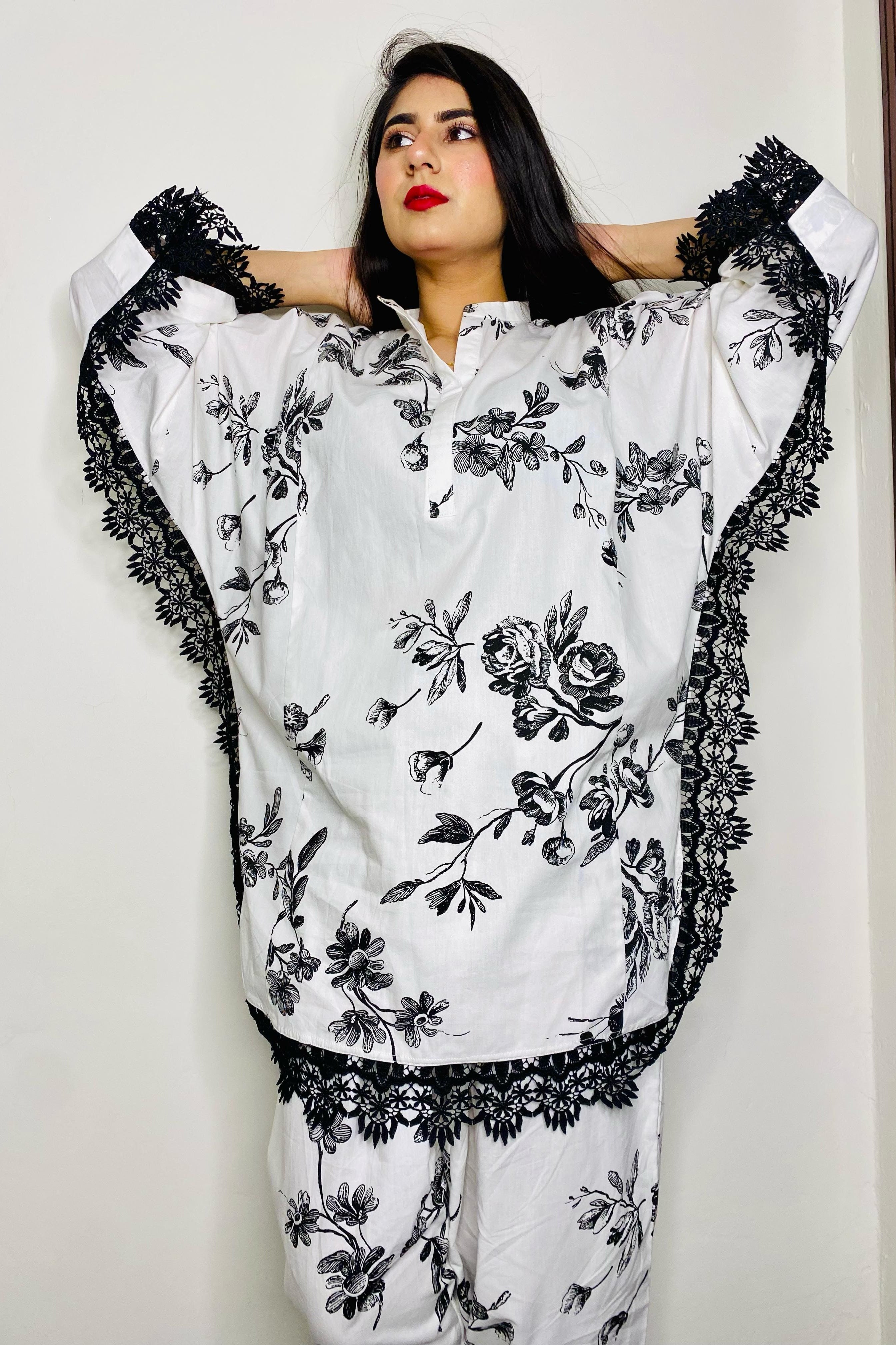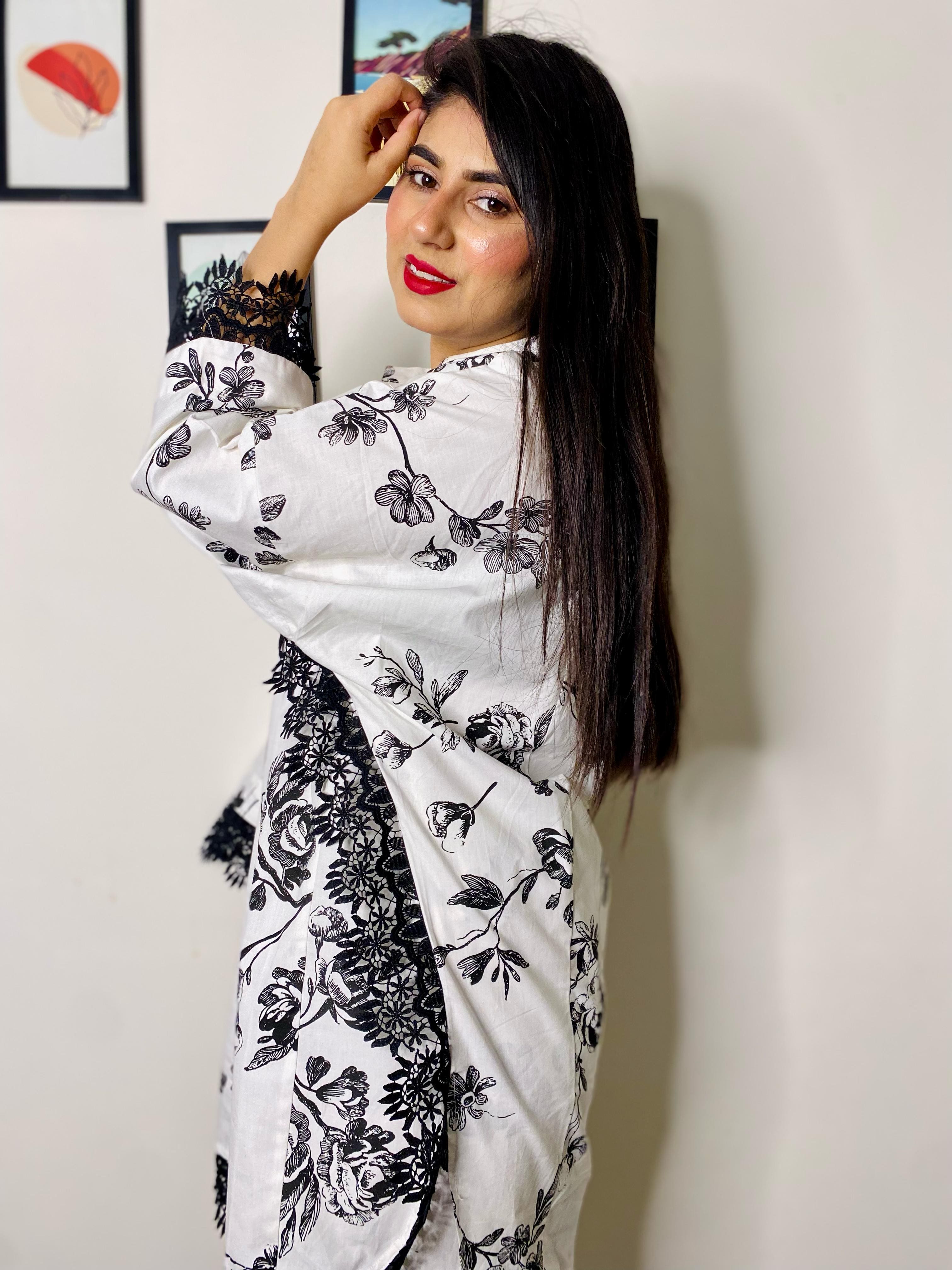 Cut from pure cotton, this set features embroidery lace on a soft white base floral print. The cut with embroidery laces starting from sleeve to whole body give a gorgeous look . The trouser is also cut from the same cotton material.