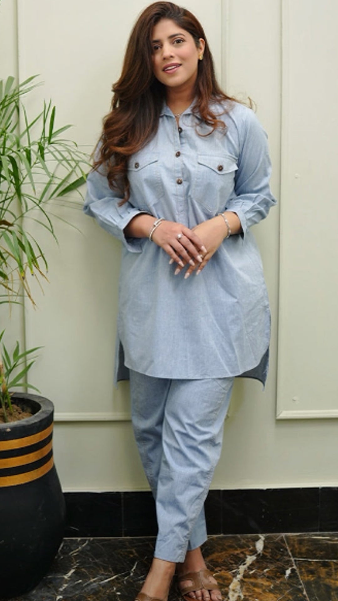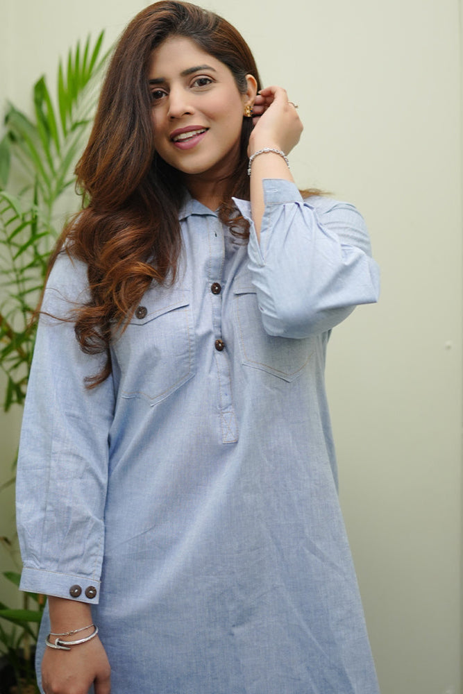 Ready to wear Embrace elegance with this grey heather chambray Co-Ord set with black button details , pockets , stylist straight sleeves with collar and cuff . Paired with sleek straight-leg pants for a timeless, chic ensemble.