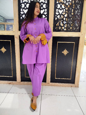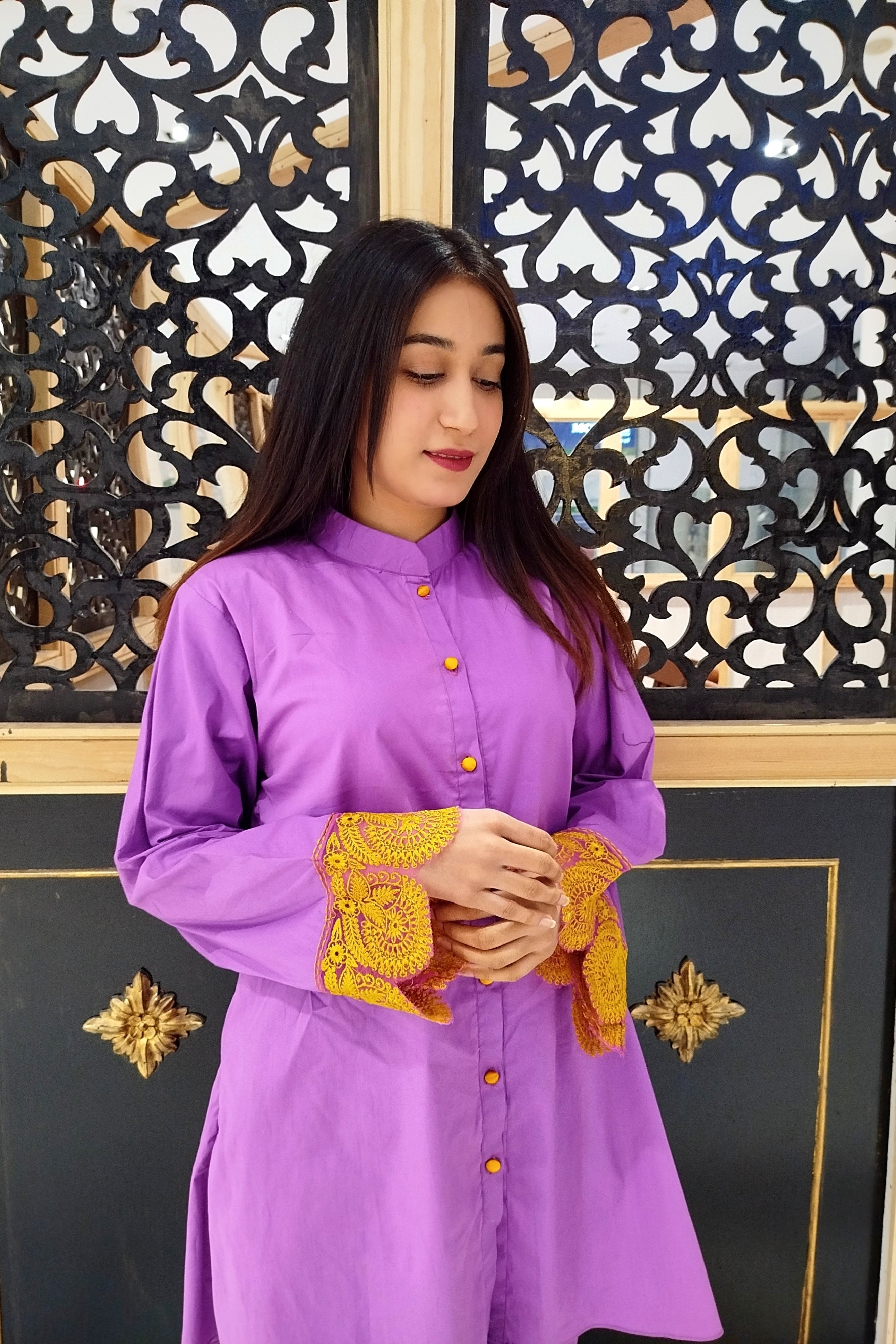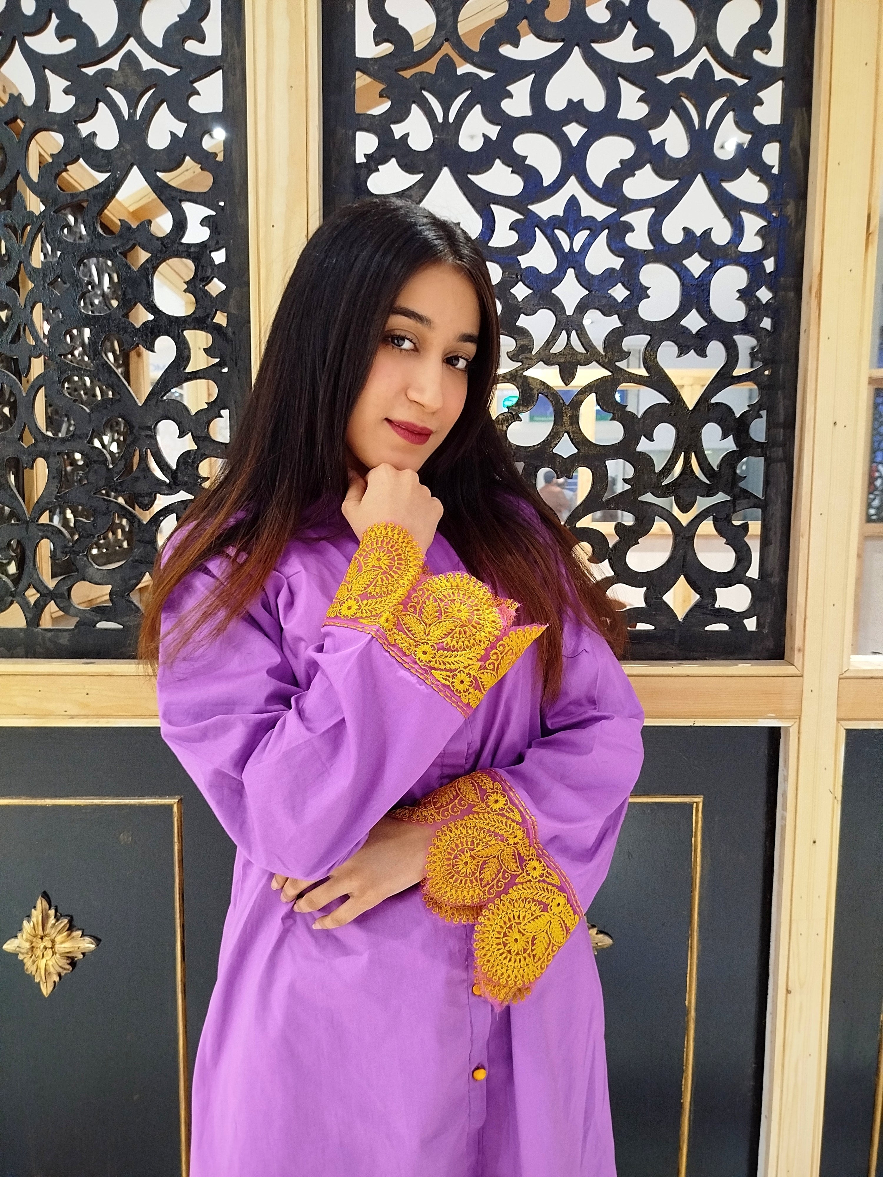 This purple ensemble with intricate embroidery offers a sophisticated yet versatile style , perfect for both day and evening events. The yellow sateen opening buttons has no match when hanged in your wardrobe