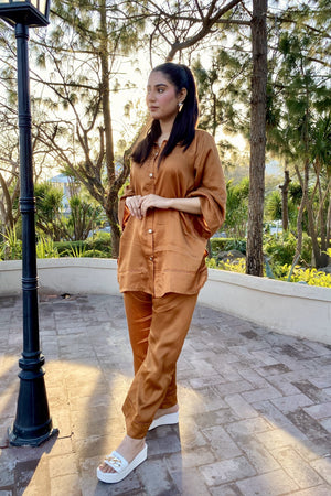 This elegant rust long co ord set is a timeless blend of luxury, perfect for both casual and formal occasions . The rich, deep rust hue brings depth to the ensemble with embroidered laces at body, while the subtle sheen of the fabric catches the light, adding an element of refinement. The outfit includes a matching TROUSER , adding an extra layer of coziness and grace.