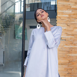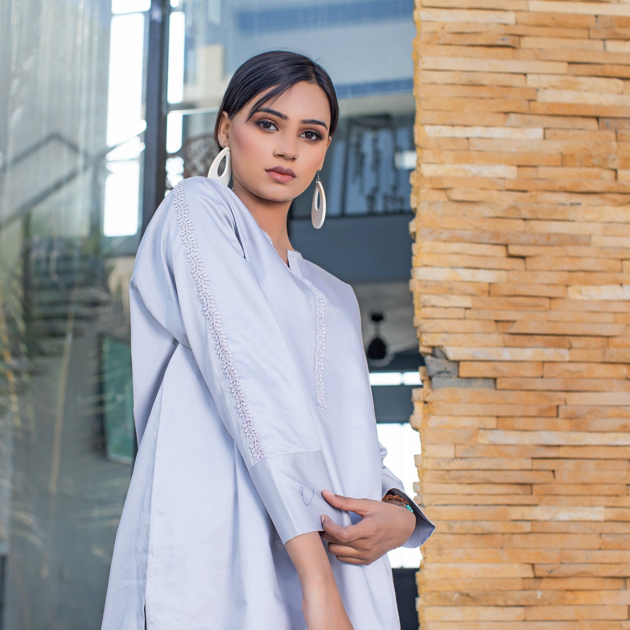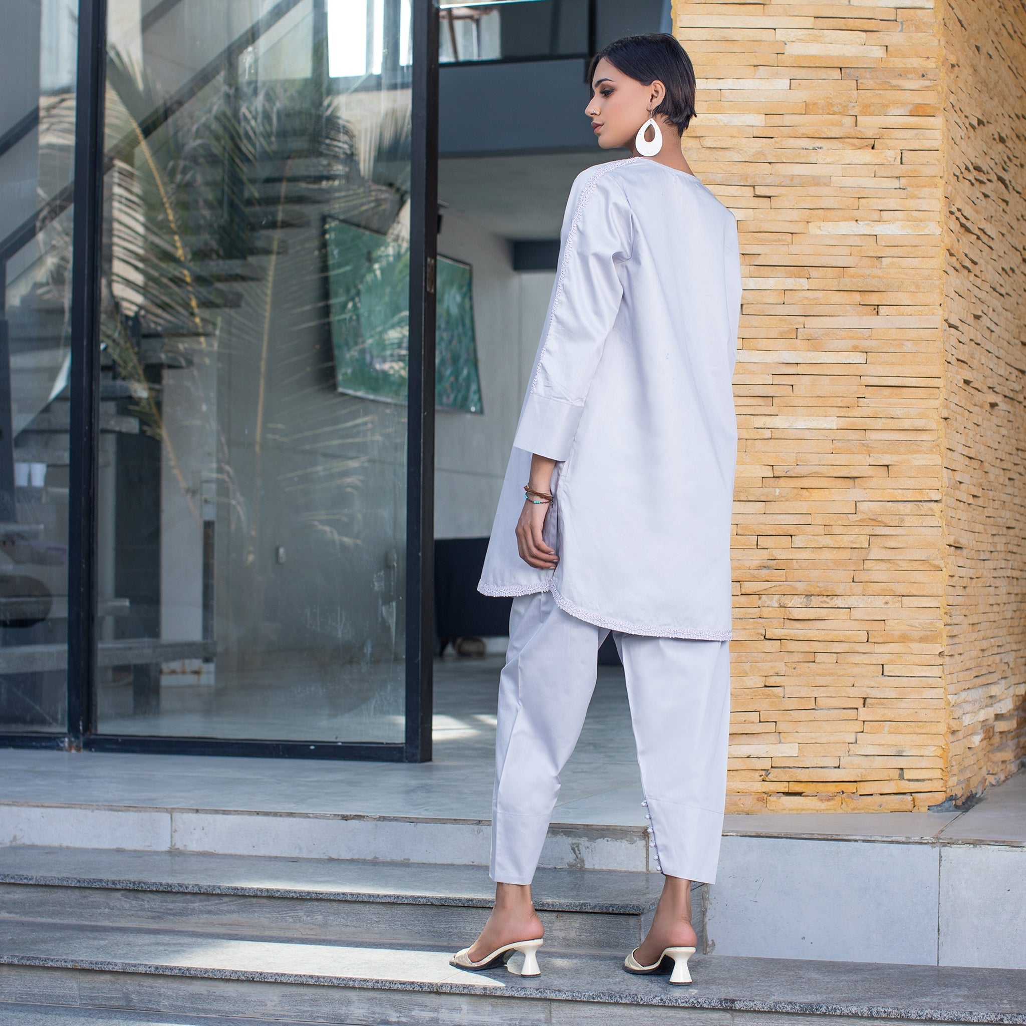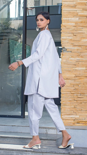 Shirt with Collar and side slits , trouser with six fabric wrapped button at bottom