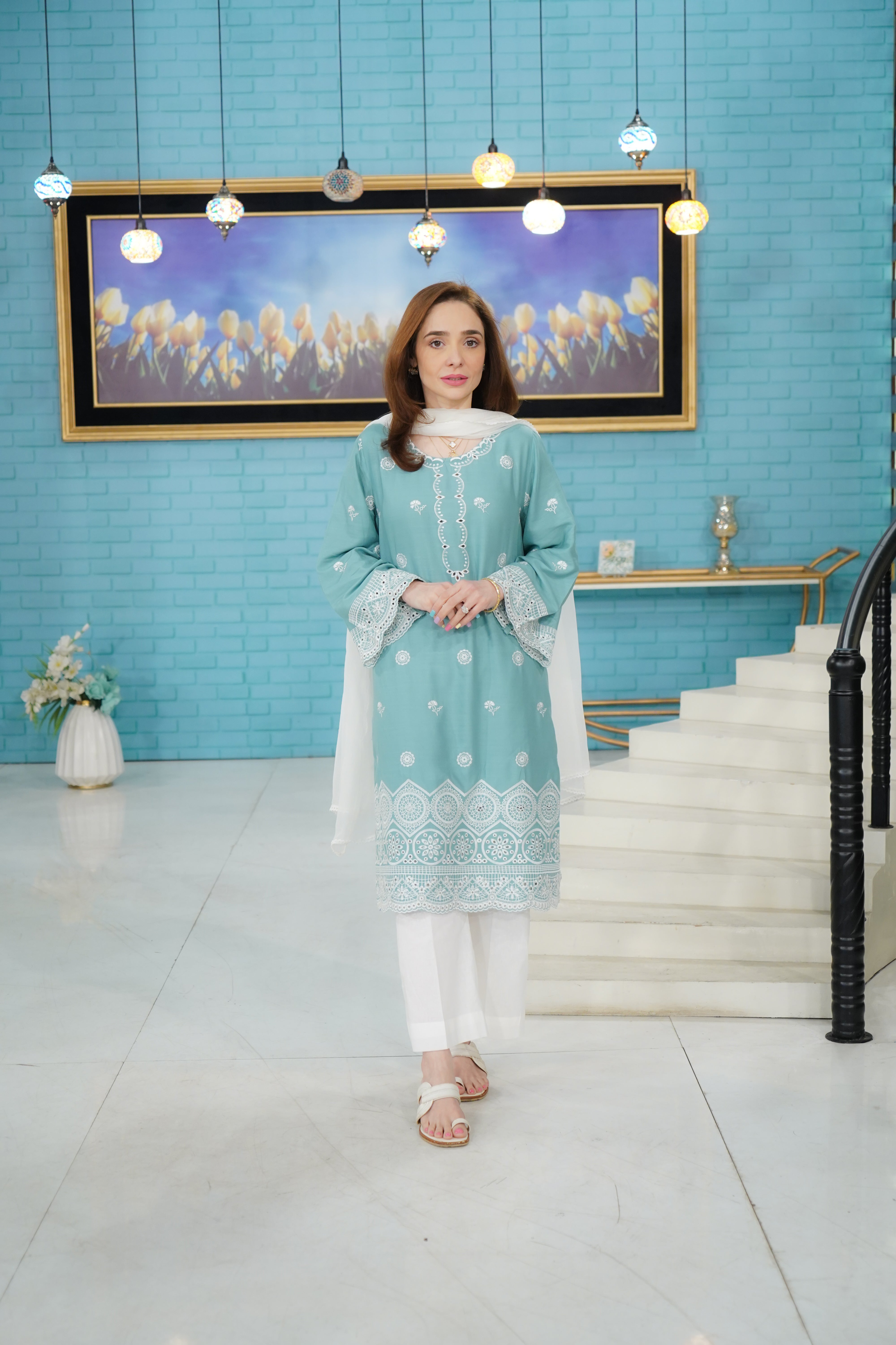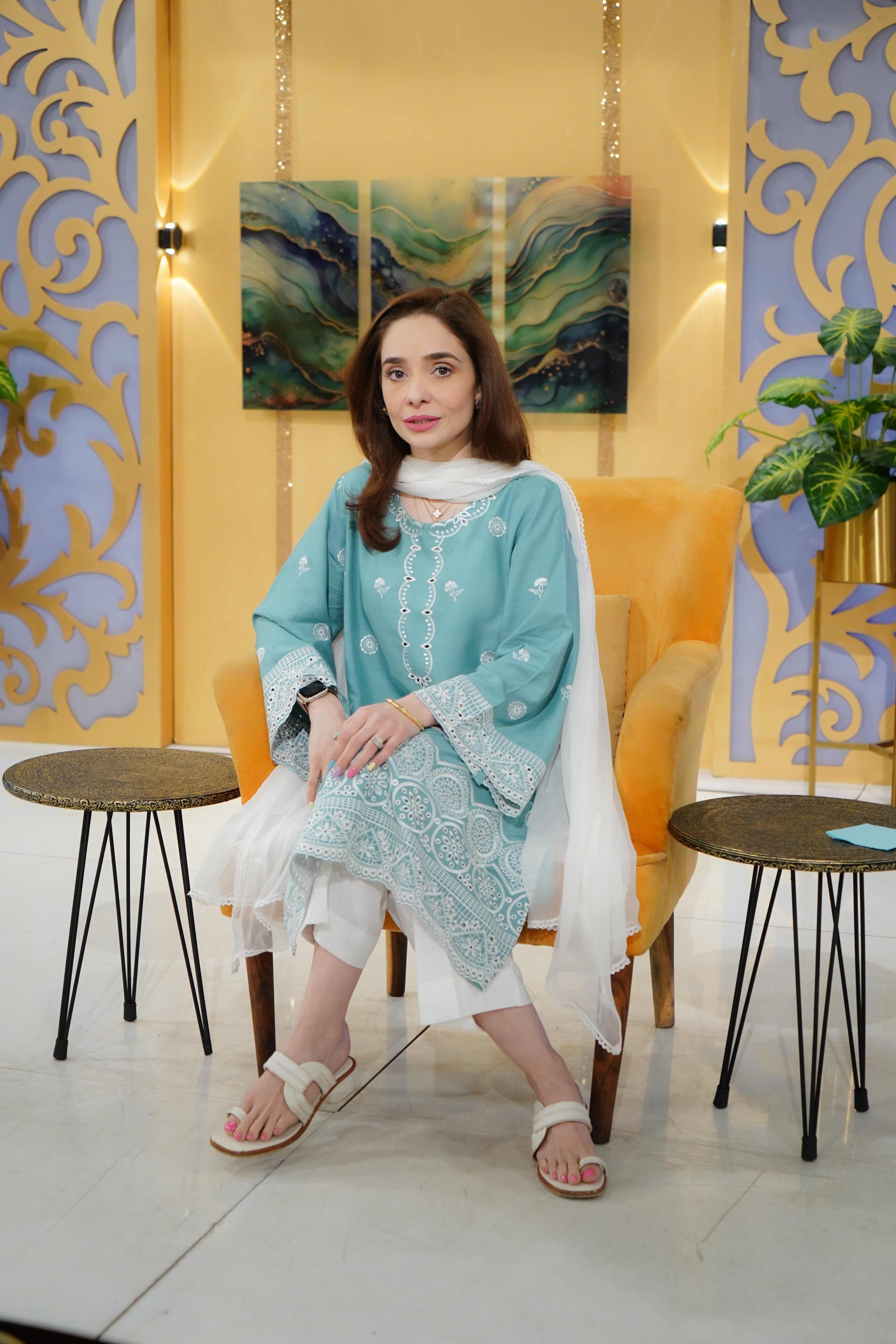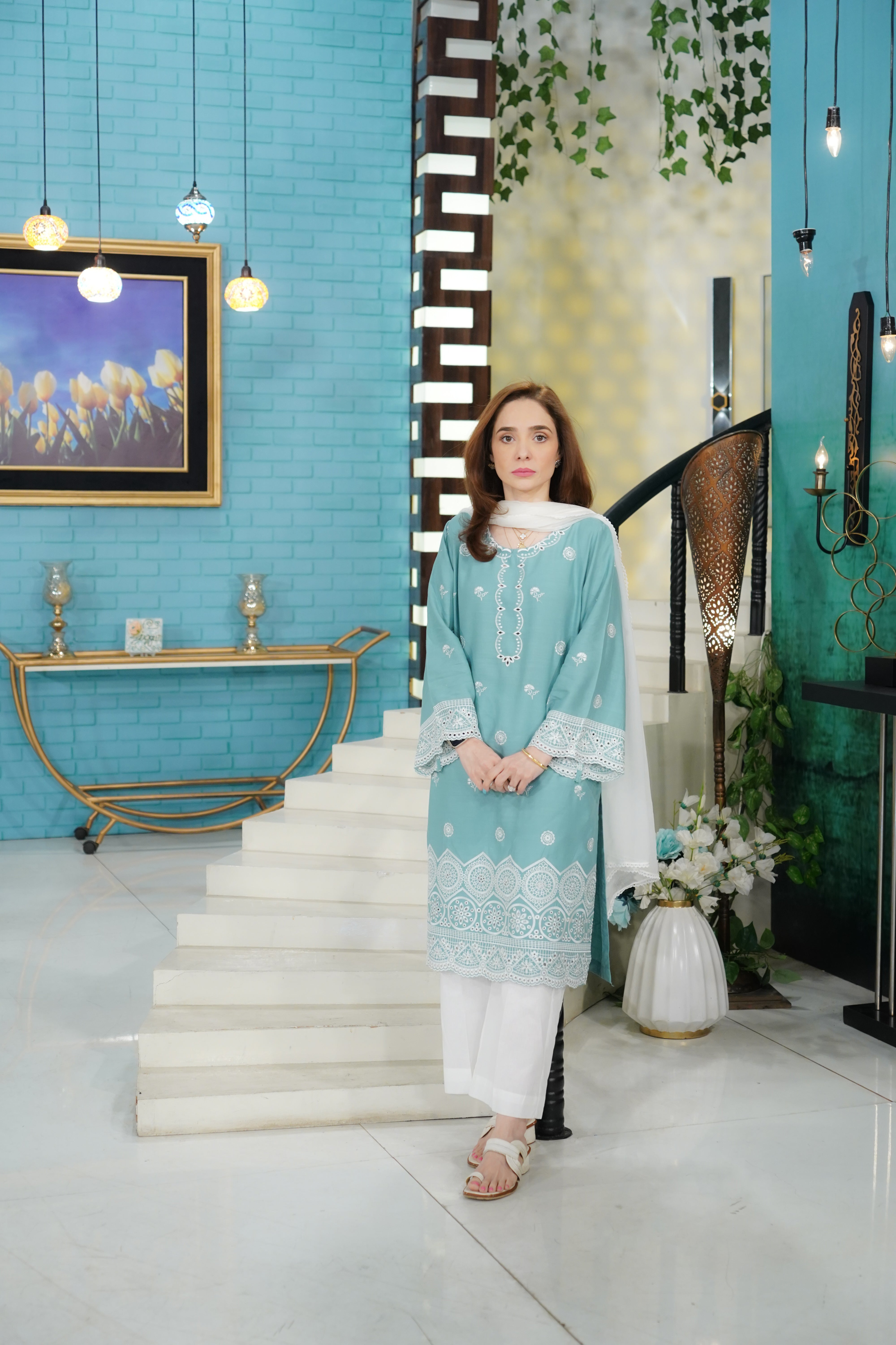 Celebrate in style. The intricately Chikankaari embroidered suit , adorned with cut work on sleeves. Perfect for any fancy launces