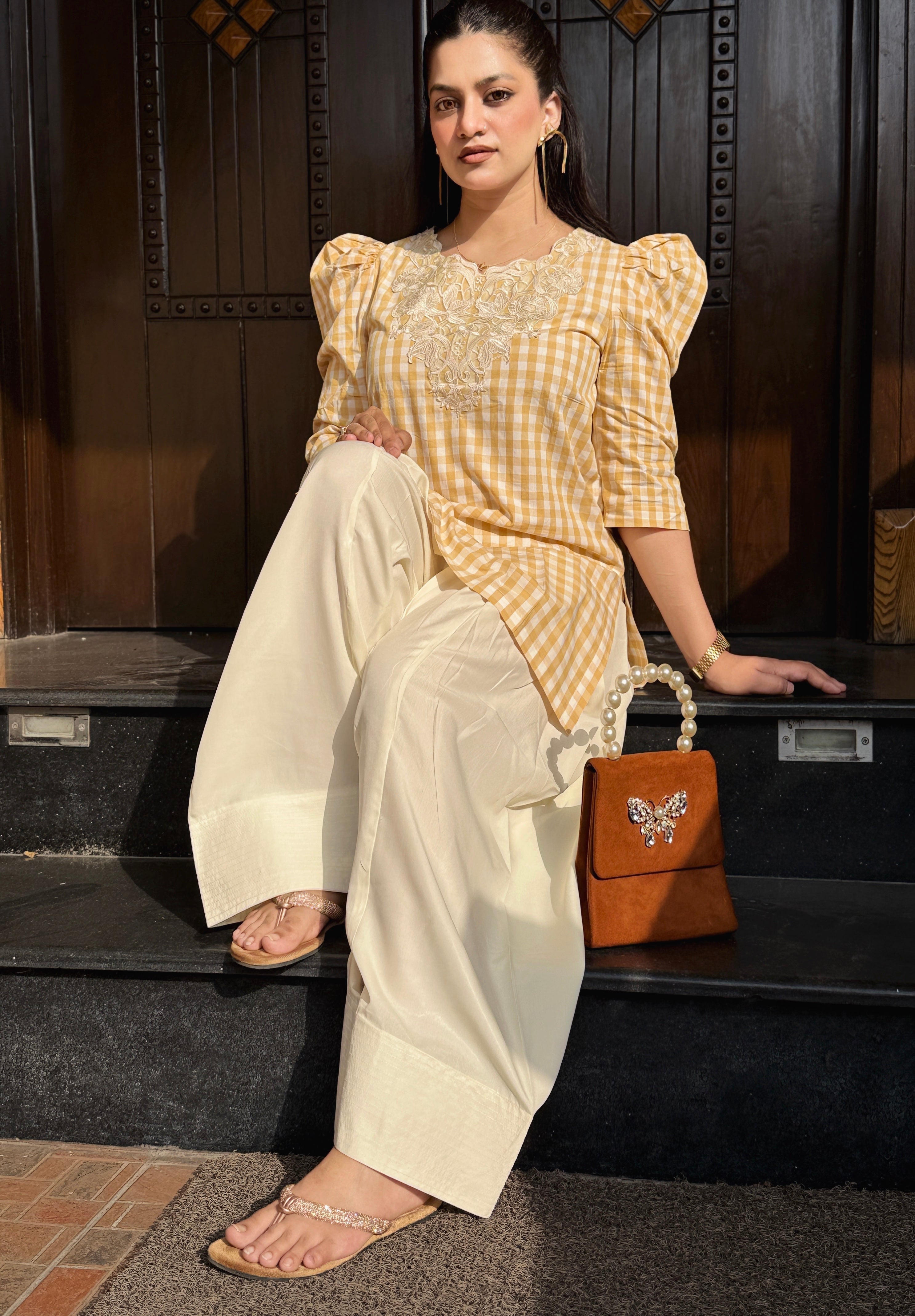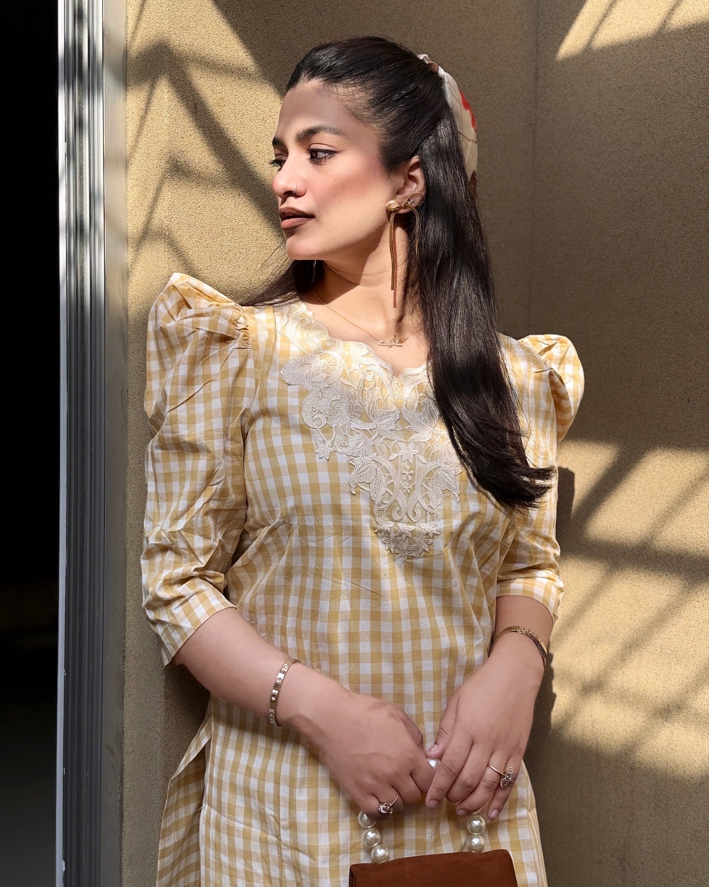 The radiant debut of our Spring/Summer ’25 collection. A blend of abstract check prints, beautifully customised embroidered neck with puff sleeves and our classic farshi shalwar cut. Elevate your wardrobe this spring with this elegantly crafted, exquisite piece.