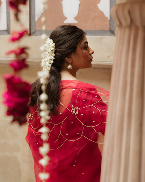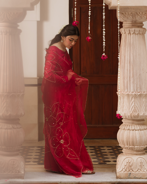 Deep Red organza saree with floral zari, gotta and sitara details. 7 yards Paiticoat and blouse included Available in stitched and unstitched