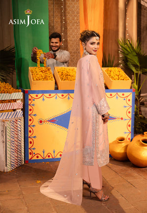 Embrace ethereal beauty with our Powder Pink ensemble from the "Chamak Damak" collection. This captivating piece features intricately embroidered front and back panels adorned with delicate silver zariwork and shimmering light gold zariwork, creating a celestial symphony of elegance and grace. The silver cupped sequins meticulously scattered across the shirt including the neckline and borders, add a touch of celestial sparkle to this resplendent masterpiece. With embroidered sleeves and daman border, this ensemble exudes timeless charm and sophistication. Paired with an embroidered dupatta, this outfit is a testament to exquisite craftsmanship and unparalleled design is perfect for any festive occasion.