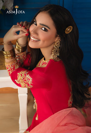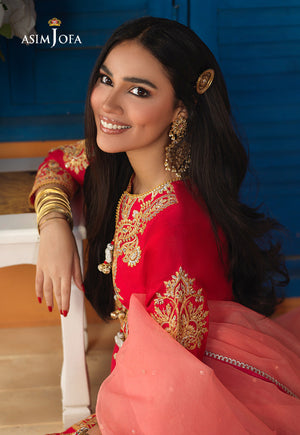 A beautiful combination of coral & peach comes together in this stunning ensemble. The shirt is adorned with an embroidered neckline & heavily embroidered border. Its paired with a flared Dhaka pajama & embroidered peach dupatta.