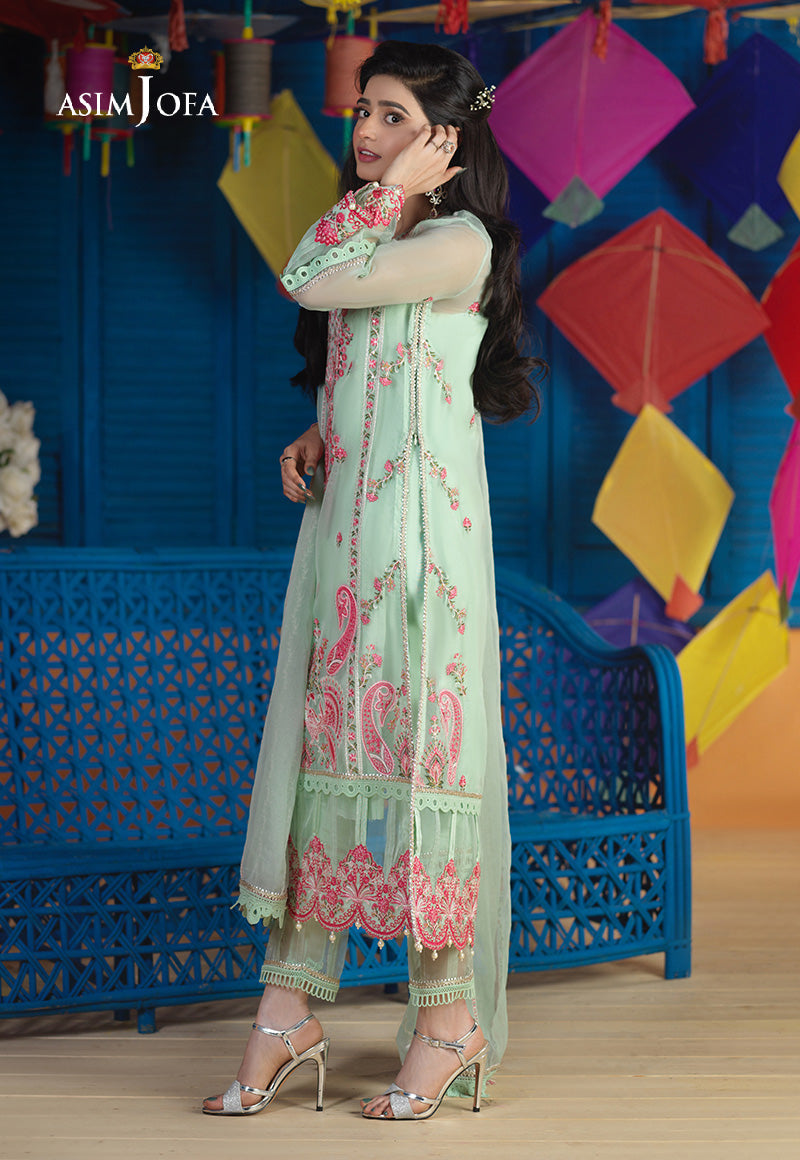 Complement the festive days with sophisticated ice green, a perfect feast for your event. Style in a sleek tailored look for this embroidered shirt enchanted with a majestic fuchsia pink embroidery and all over pani sitara and multiple color thread chan botis. It is beautifully coordinated with a delicately embroidered organza dupatta and dyed trouser. This is the outfit to pull out for a festive dress up moment.