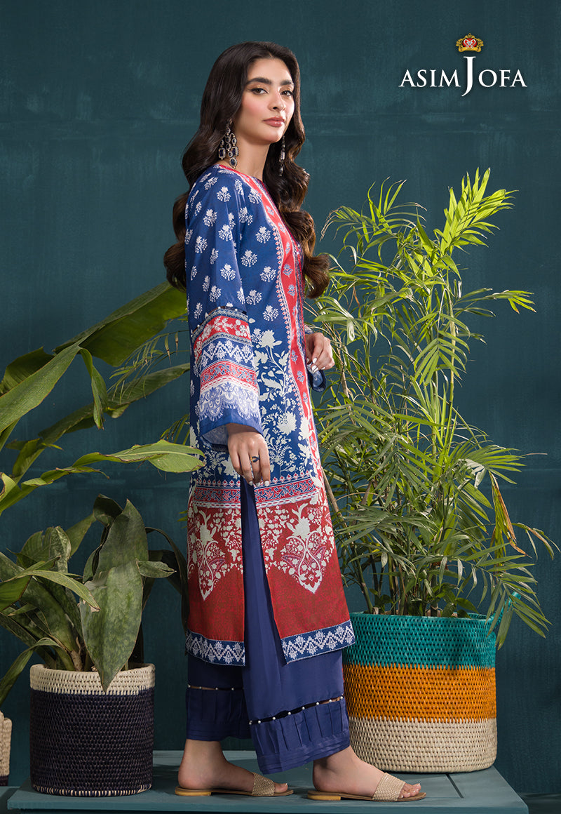 Step into regal sophistication with this outfit that includes a royal blue shirt, luminous embroidery, and a fiery Indian Lawn dupatta.