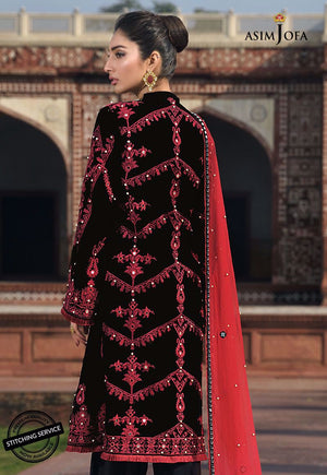 This breathtaking combination of red and black speaks for its elegance. A beautifully composed embroidery pattern which is hand crafted with mirror work and pearls inspired by traditional balochi dress and old craft techniques on lawn fabric. Combined with a dyed dupatta embellished with all over mirror, pearl chan and dyed trouser. This is a versatile look that needs minimal accessories.