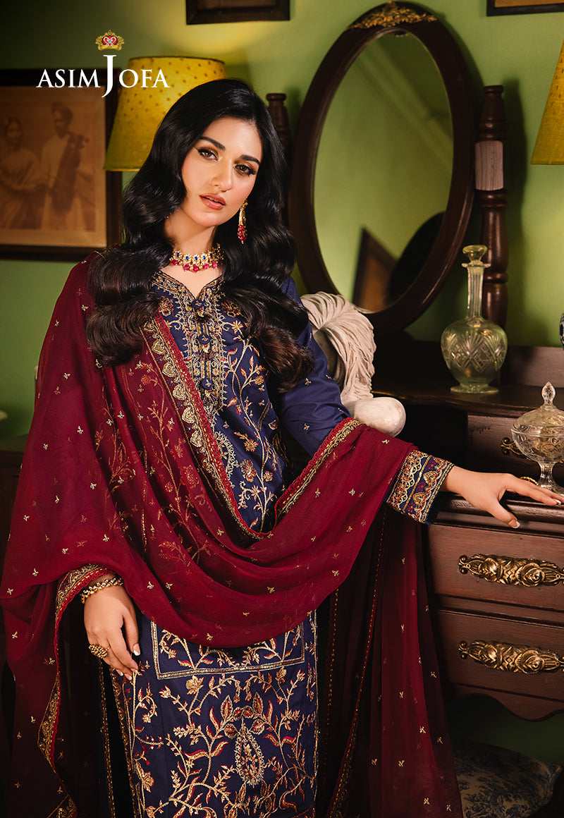 Channel the unwavering strength of the midnight sky with this sophisticated navy-blue ensemble. The tailored shirt in a deep, inky blue shade breathes life into the embroidered work artfully crafted with maroon thread and gold zari work, enhanced by gold cupped sequins that accentuate the overall look. The embellished chiffon dupatta in the contrasting hue of maroon, adorned with constellations of tiny sequins, evokes the mysteries and wonder of the starry night.