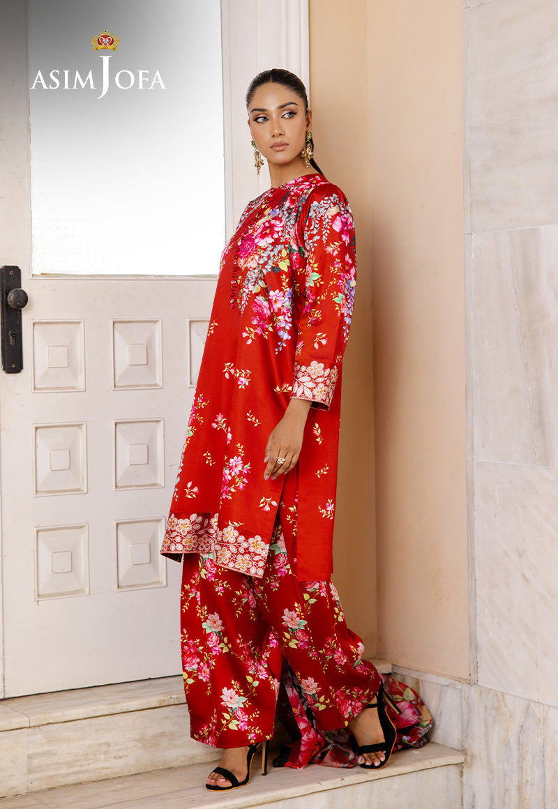 This striking red ensemble is a celebration of graceful charm and rich texture. The smooth, silky fabric is adorned with a gorgeous floral print, while the shirt features subtle sequin embellishments along the hem and sleeves, adding just the right hint of sparkle. Paired with printed trousers and a matching printed dupatta, this look captures elegance with a festive flair—perfect for making a statement with effortless poise.