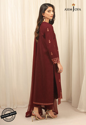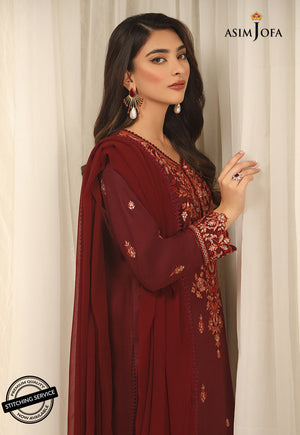 A gracefully elegant design is layered over this trendy self-jacquard ensemble rendered in a deep maroon shade. It consists of a contemporary silhouette adorned with intricate embroidery paired with a chiffon dupatta. This resplendent outfit is a style statement for formal gatherings this season.