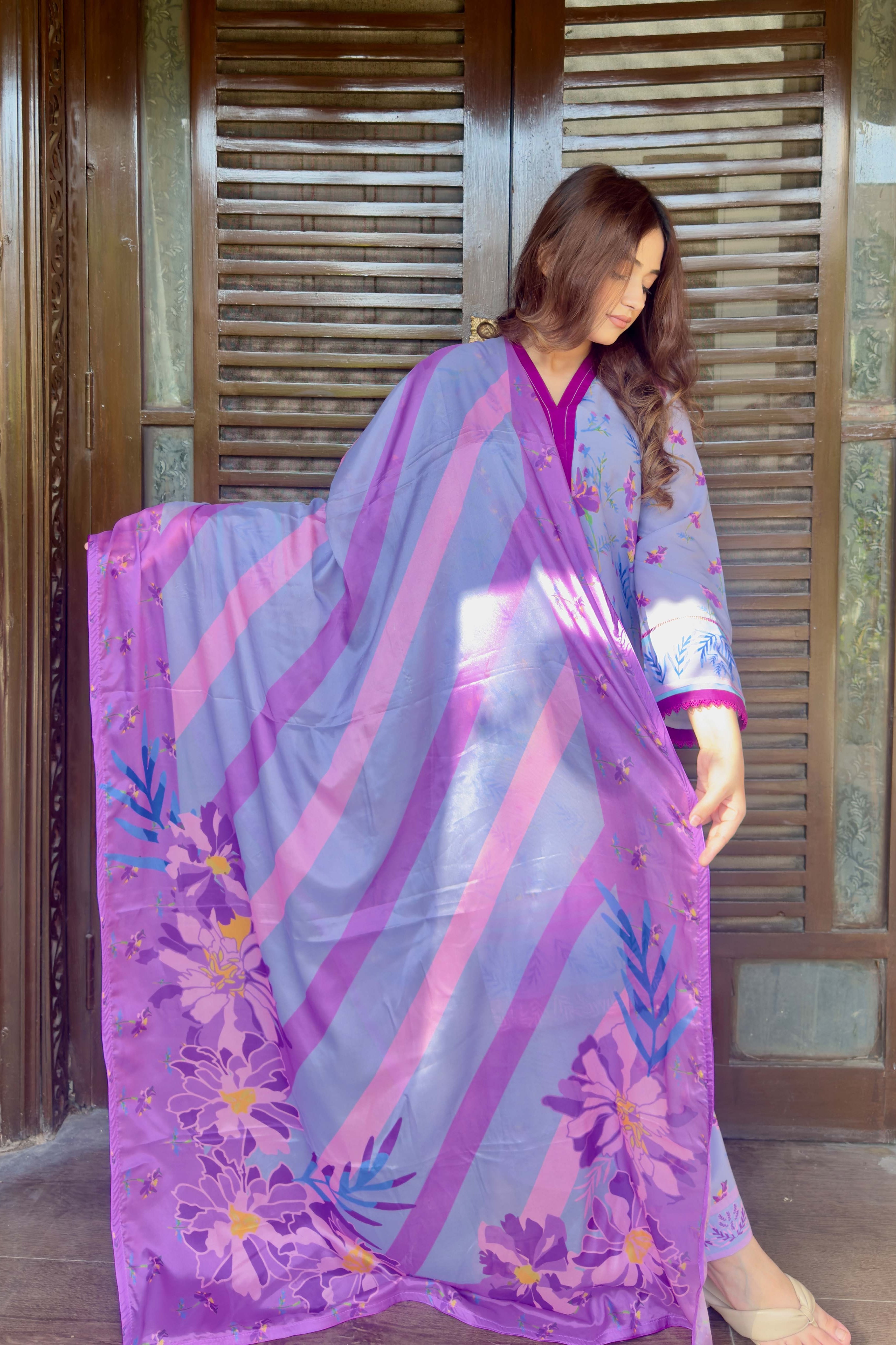 Embrace graceful charm with this 2-piece digital print ensemble in a dreamy Lavendar shade.