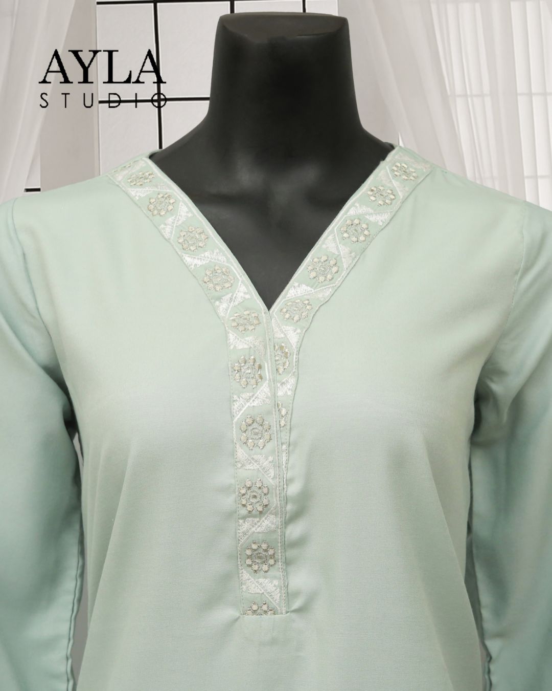 The soft pastel tone enhances your natural charm, while the fine detailing adds a touch of sophistication to your eastern wardrobe. Style it with minimal accessories for an effortlessly graceful look.