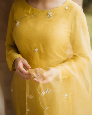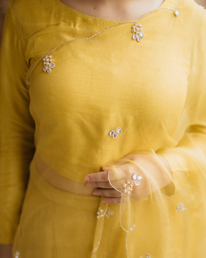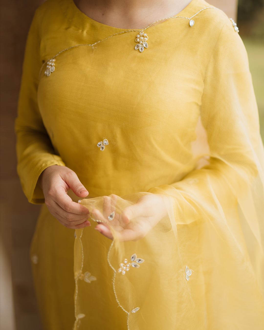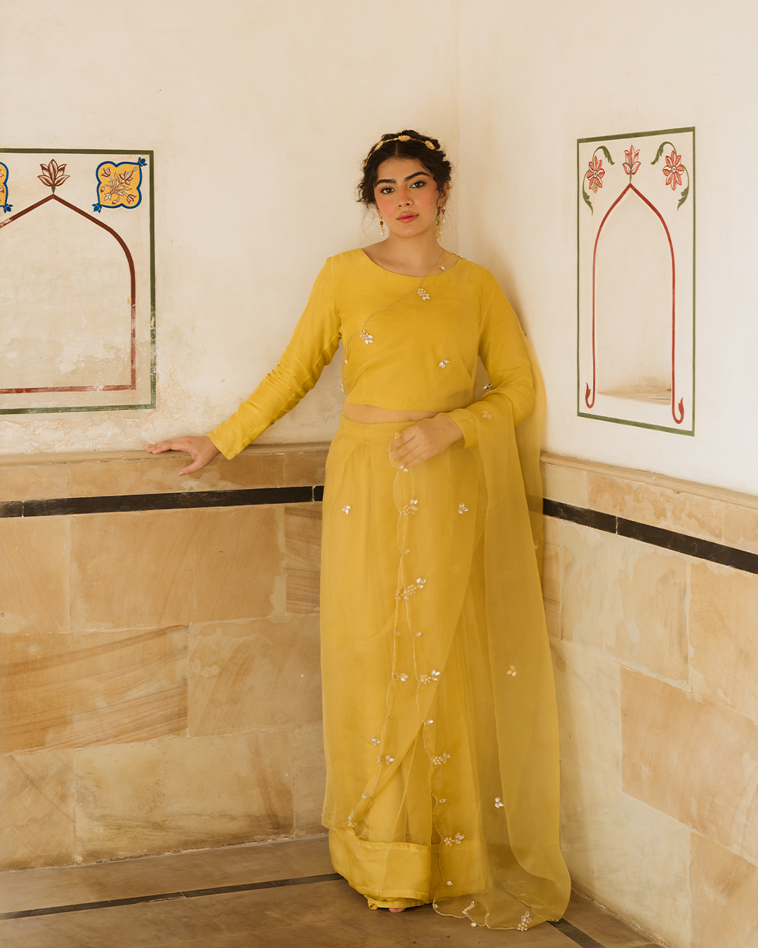Ochre colored organza saree with Kundan, nakhsi and pearls details with scalloped border. 7 yards Paiticoat and blouse included Available in stitched and unstitched