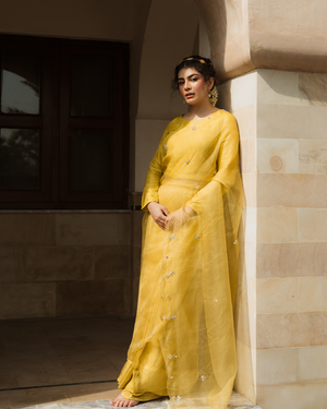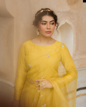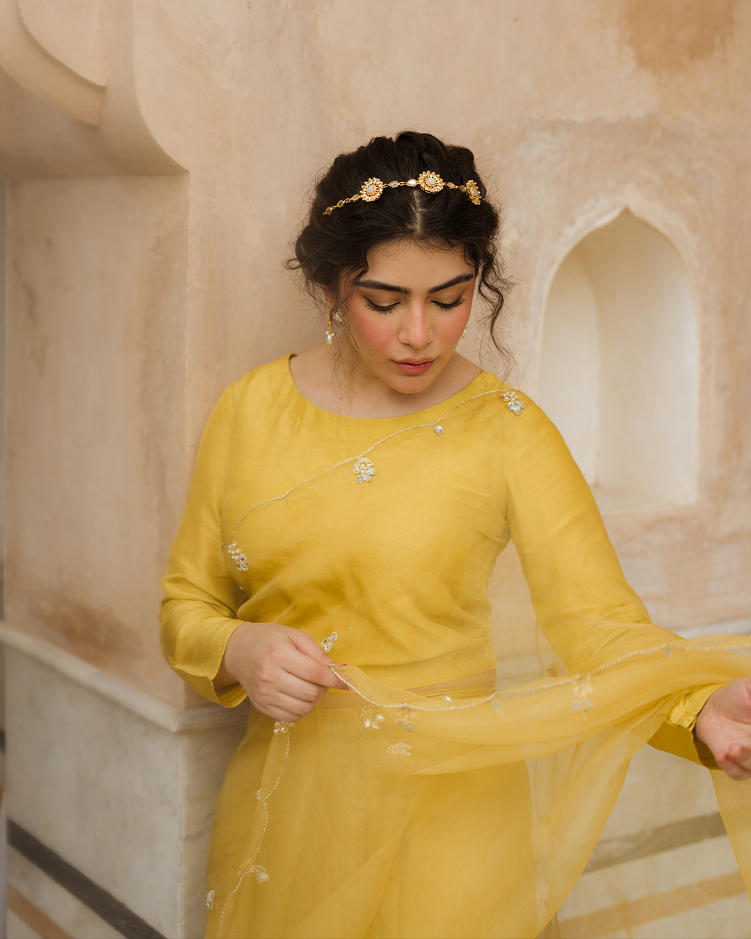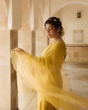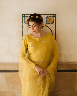Presenting ‘Bad-e-Naseem’—a breathtaking Mustard Organza saree adorned with a tilla scalloped pallu and intricate kundan and nakshi work. Experience elegance in every detail, where timeless grace flows effortlessly.