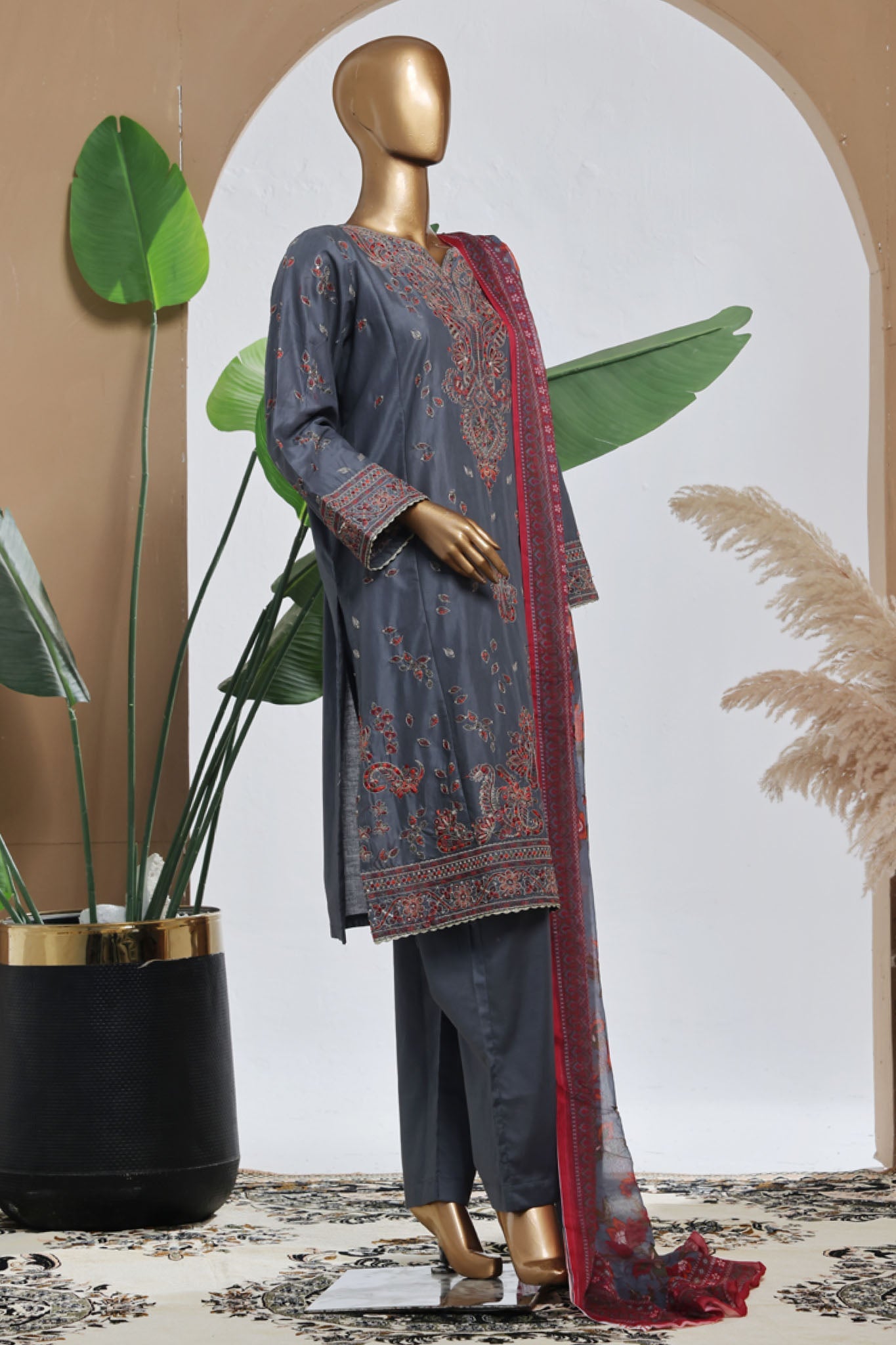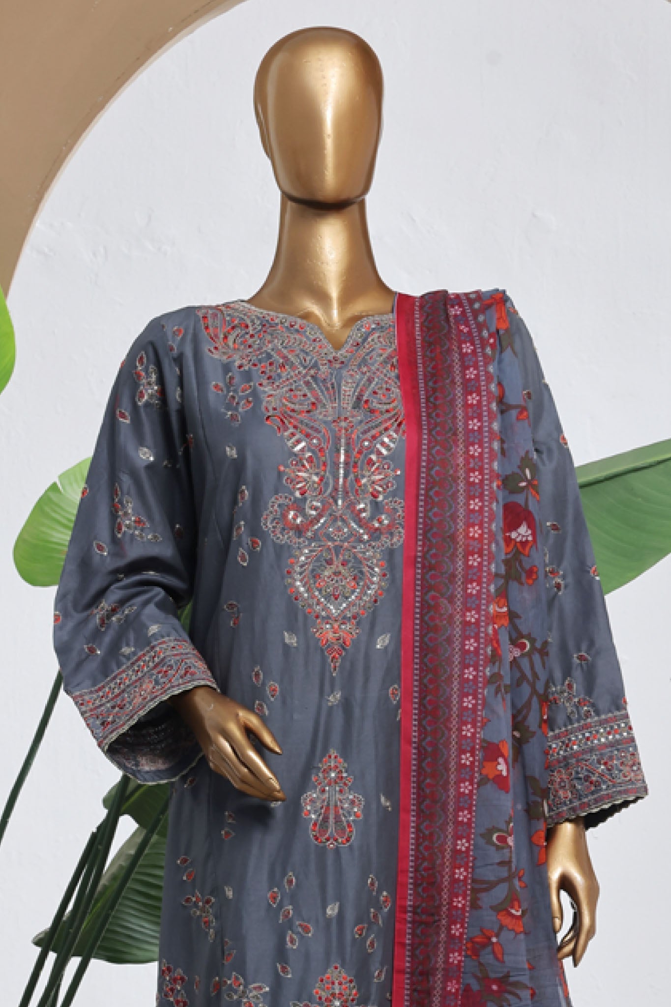 Bin Saeed Stitched 3 Piece Luxury Plain Cotton With Chiffon Dupatta Collection'2025-SMPC-2076-Grey