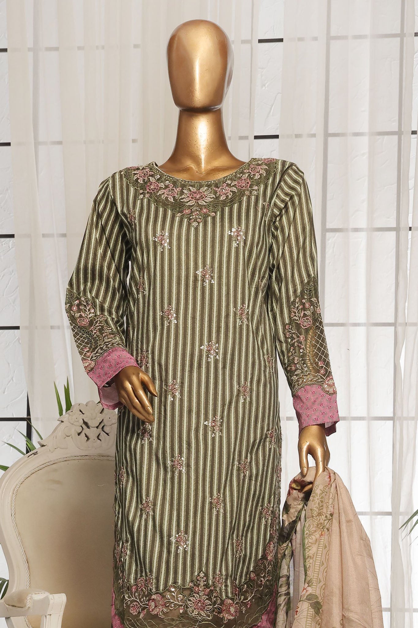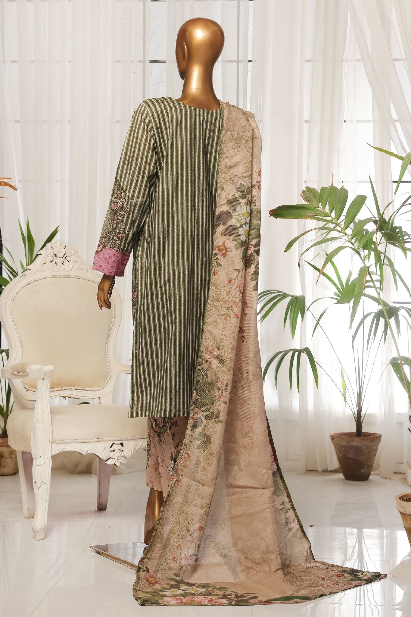 Bin Saeed Stitched 3 Piece Luxury Self and Stripe Vol-02 Collection'2025-SM-1965-Green