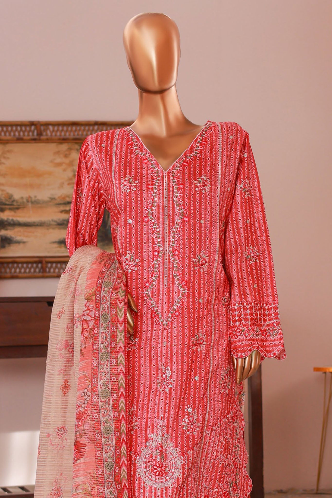 Bin Saeed Stitched 3 Piece Self Stripe Vol-02 Collection'2025-SM-2086-Red
