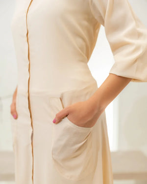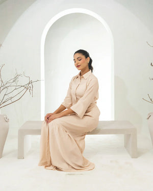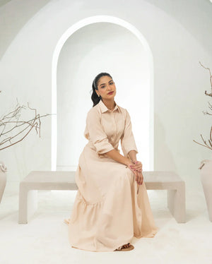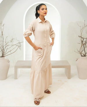 Embrace the epitome of comfort and style with our stunning Bisque Fawn Long Dress. Crafted from premium, wrinkle-free crepe fabric. It’s a shirt collar button down long dress with flattering cinched waist and elastic detailing on sleeves. Its flowing, floor-length design makes it perfect for any occasion, from a casual day out to a special evening event. The wrinkle-free fabric ensures you look polished and put-together, without the hassle of ironing.