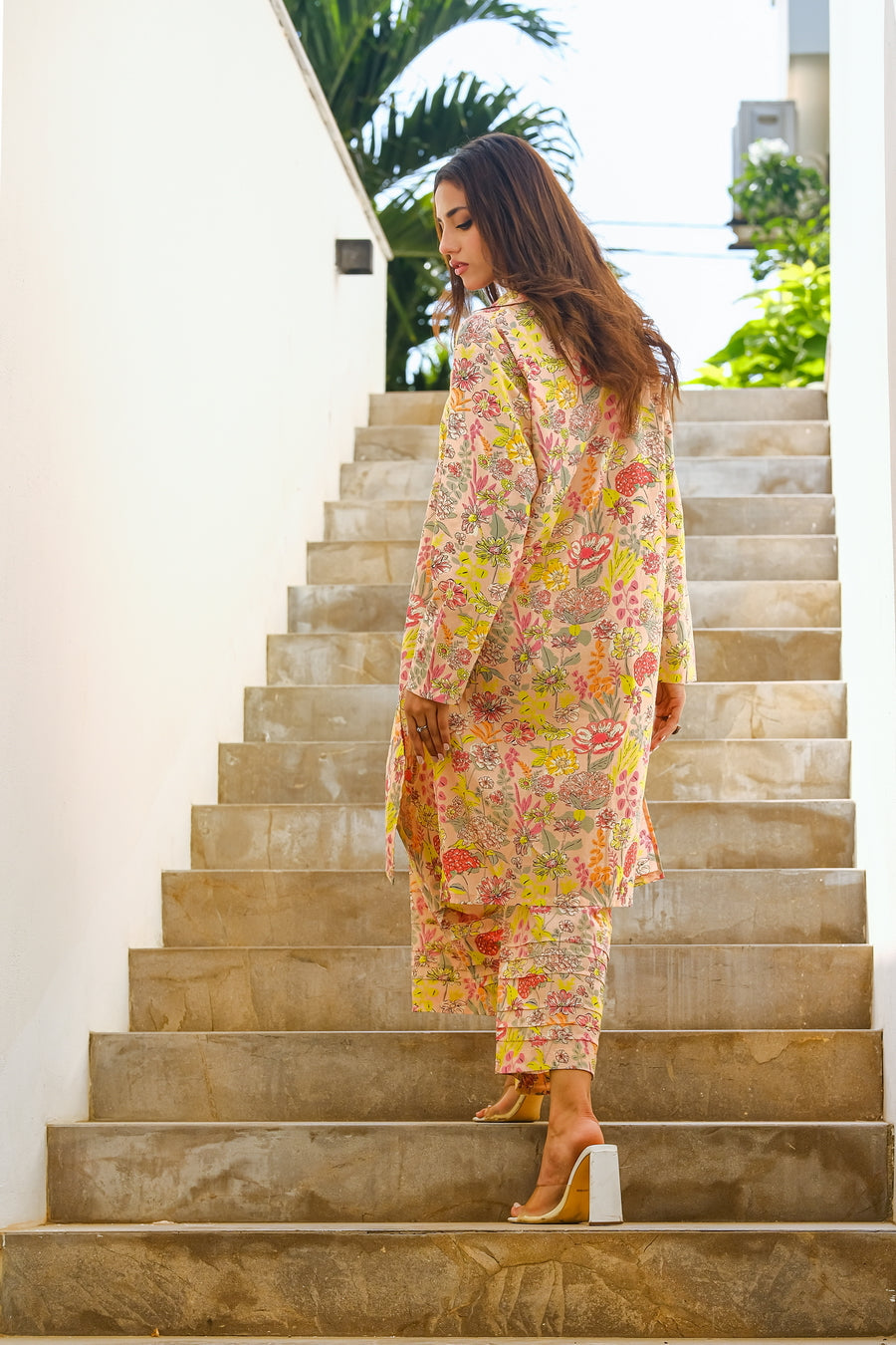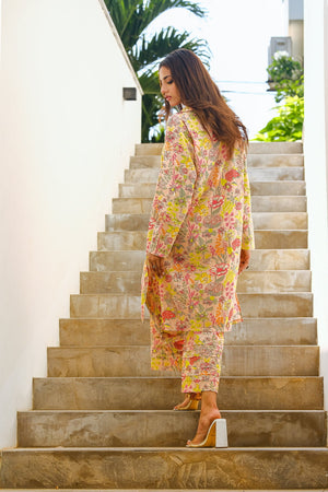 This pink cotton lawn outfit with an all-over print of pink, red, and purple flowers offers a delightful blend of color. The soft pink base creates a subtle blush effect, while the floral print adds a touch of vibrancy for a summer look.