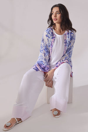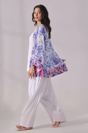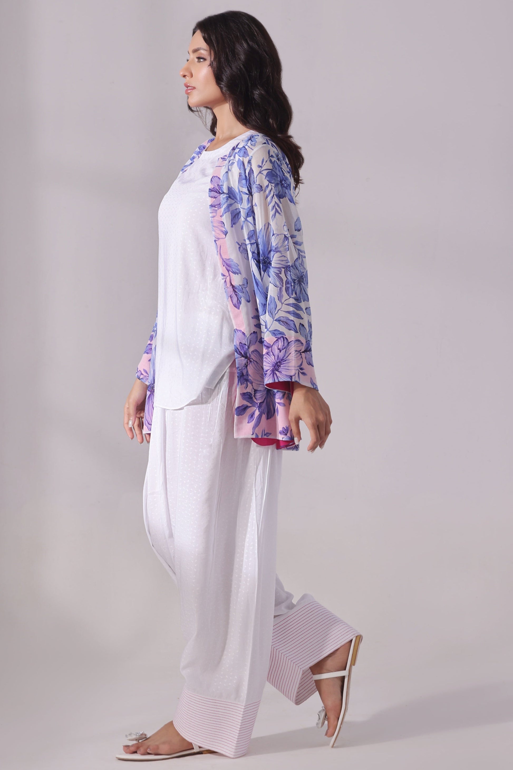 Effortless elegance meets everyday comfort in this Blue & White Floral Print Cardigan Set. The airy, open-front cardigan showcases a soft floral pattern in soothing blue tones with subtle pink accents, creating a fresh and feminine look. Underneath, a plain white top keeps the focus on the statement layer, while the flowing white farshi bottom adds a touch of traditional grace with a contemporary twist.