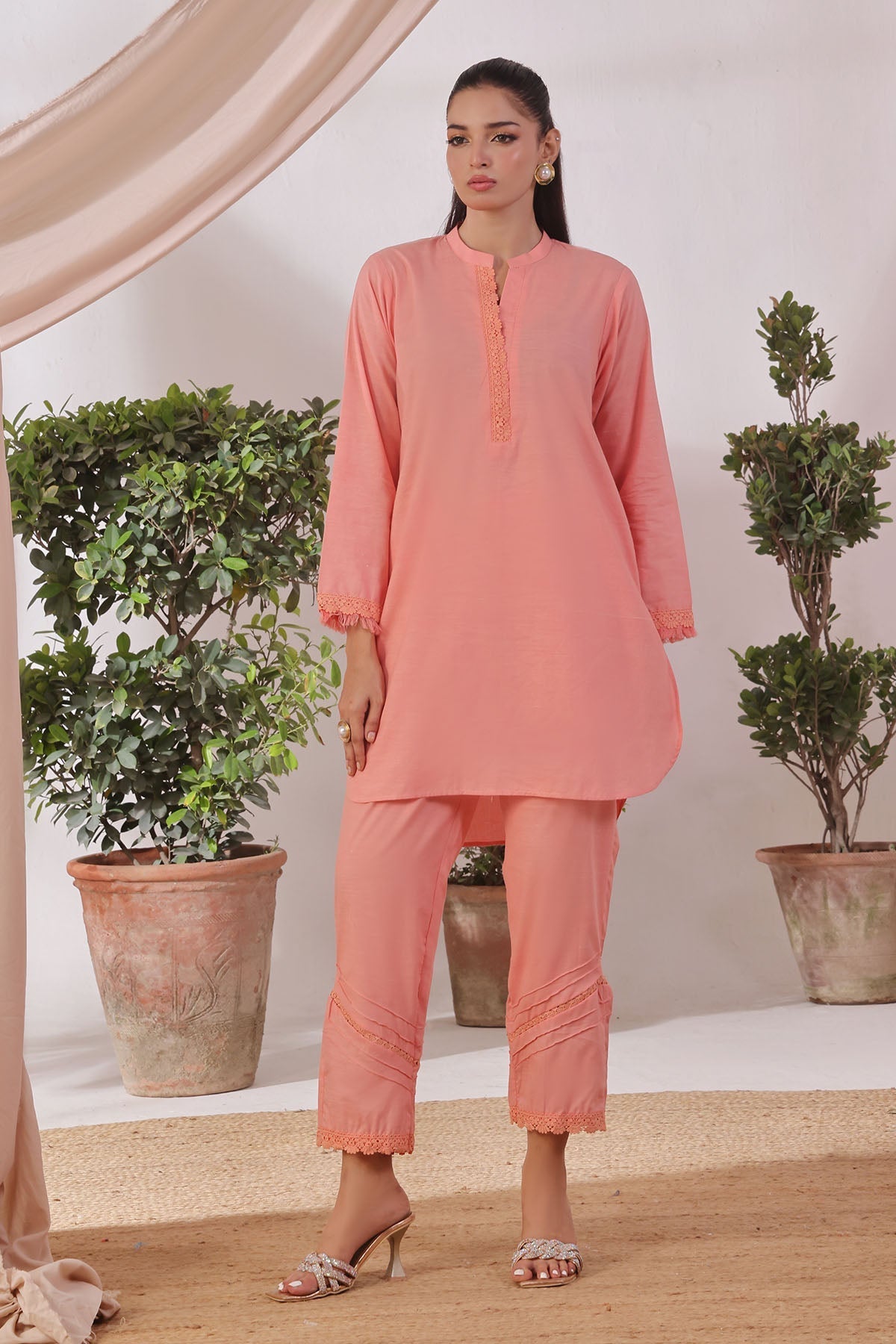 Top: Peach Slub Lawn Kurta With Crotia Laces