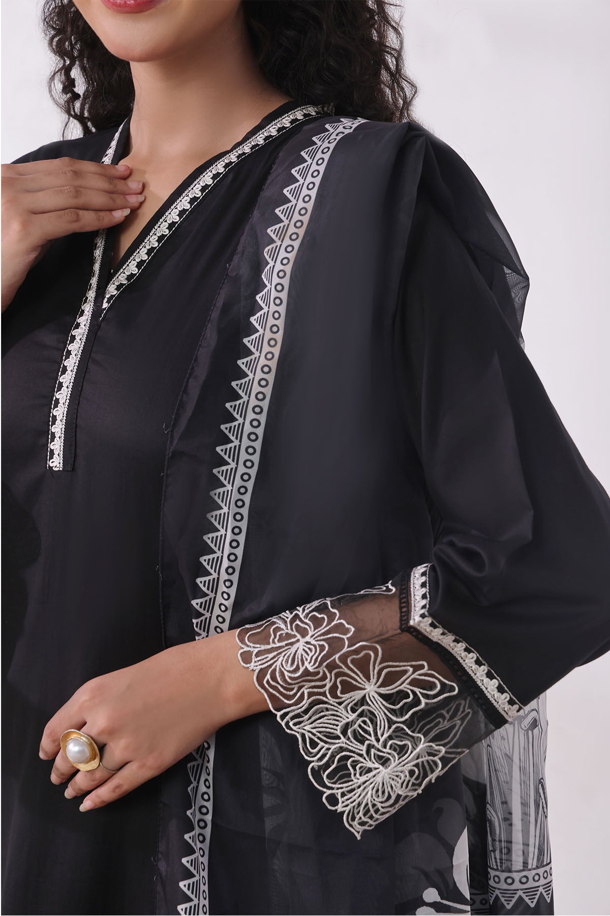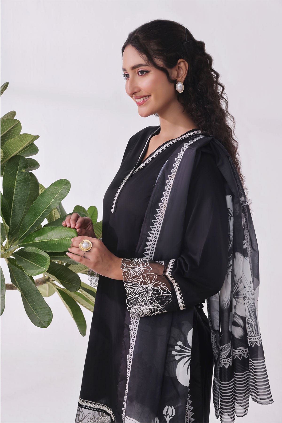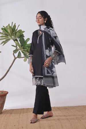Bottom: Black Cotton Trouser?br>Dupatta: Black Silk Digital Printed Dupatta