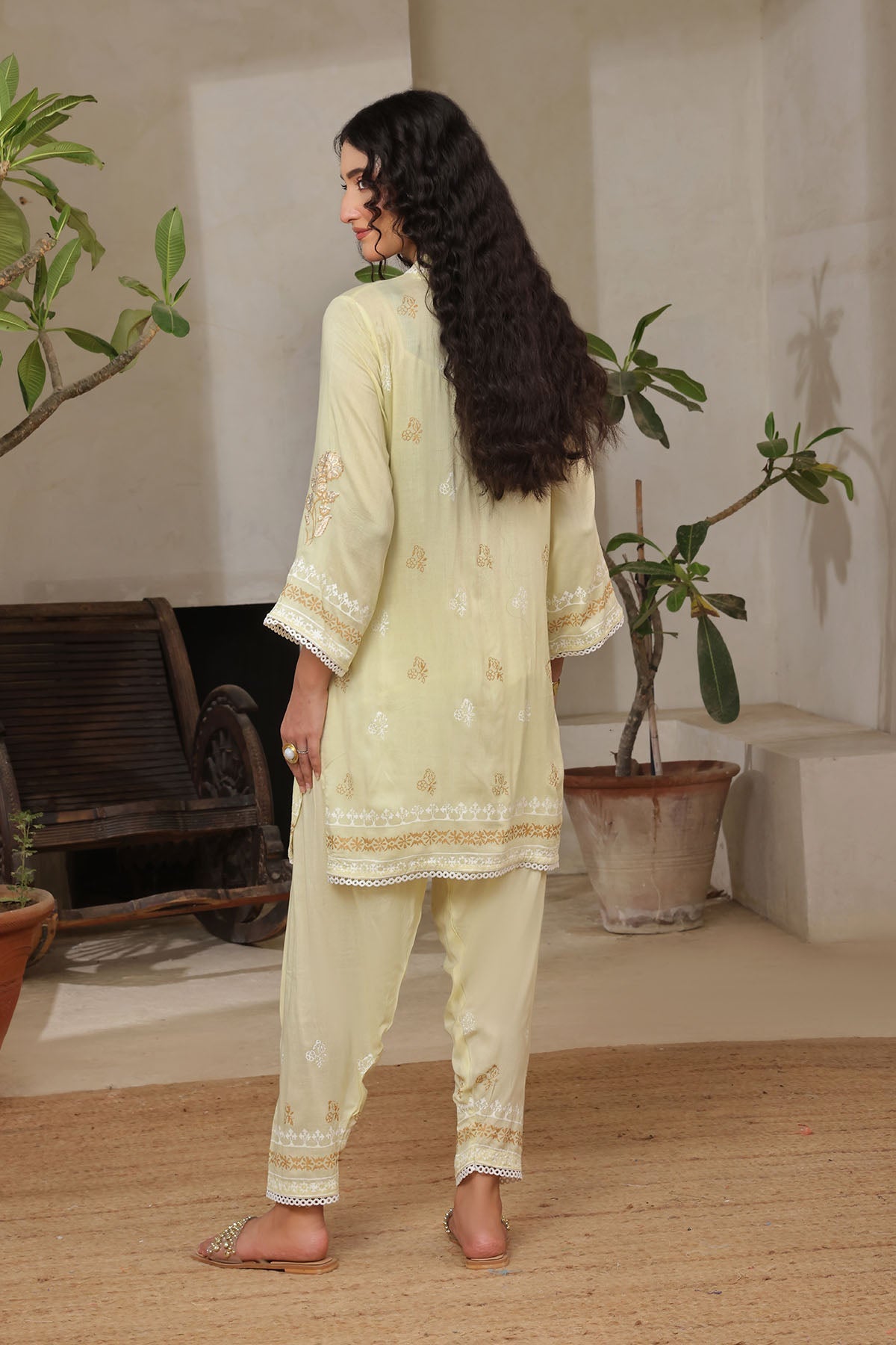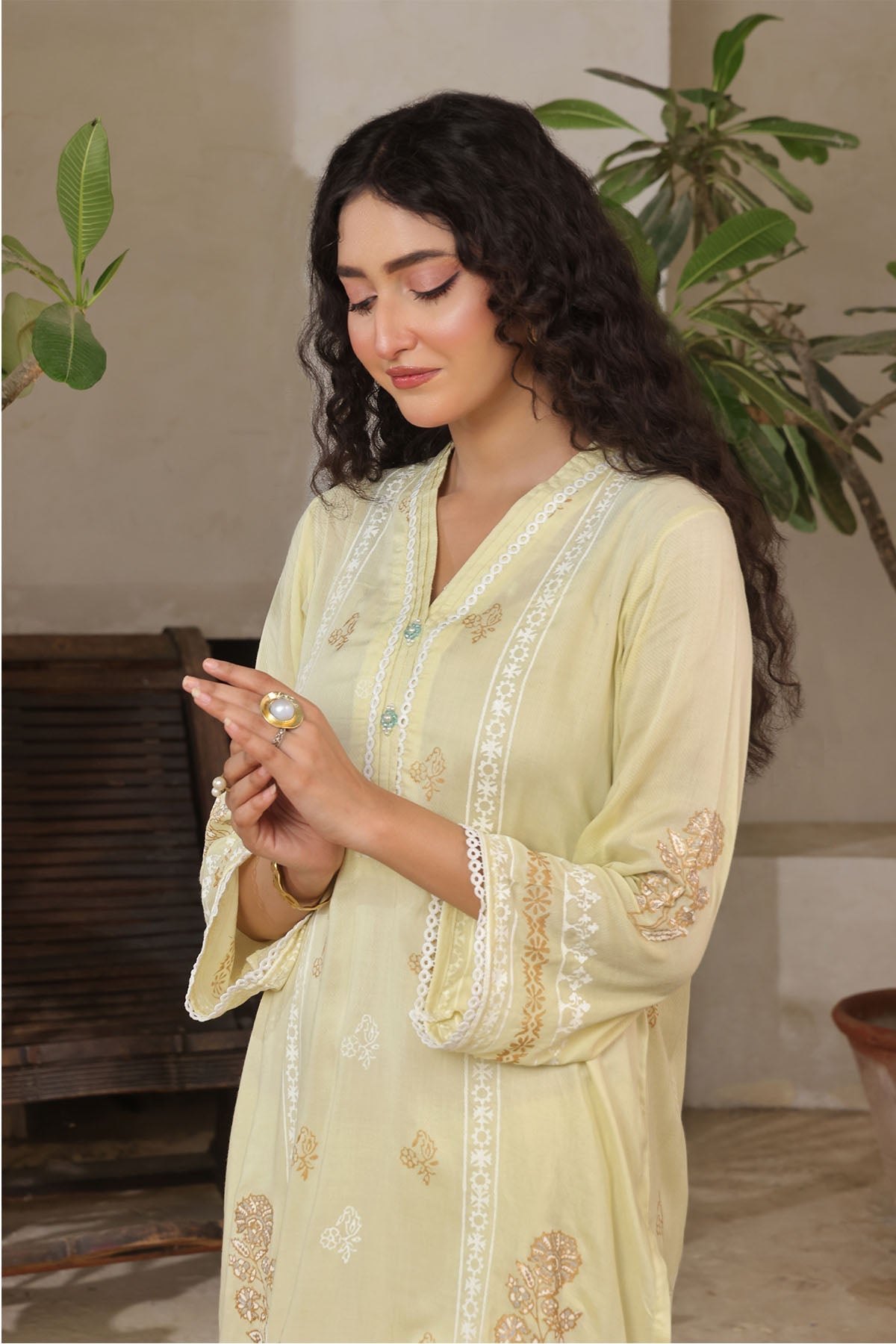 Top: Lemon Yellow Rod Silk Kurta With Block Print?br>Bottom: Lemon Yellow Rod Silk Shalwar With Block Print?/p>