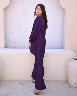 Deep violet matching set includes square cut shirt and boot cut style pants in-house khadi cotton fabric suited for winters.
