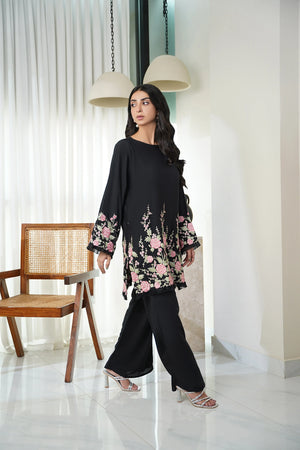 This article consists of a solid 2-piece set with an intricate embroidery detail touch on the shirt. The outfit consists of a long-length style shirt and fitted pants.