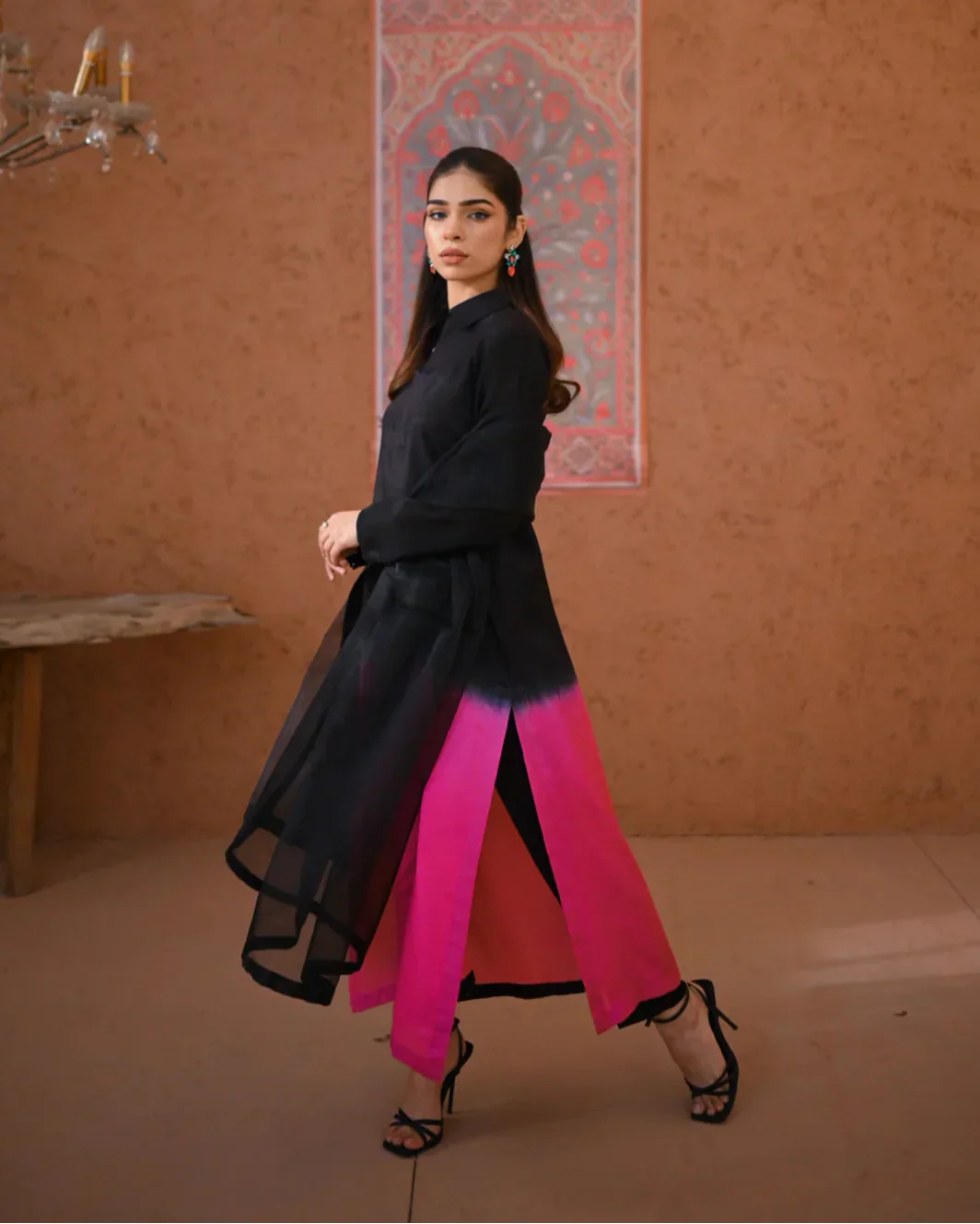 It’s a three piece dress includes a long ombre shirt and trouser along with organza dupatta.