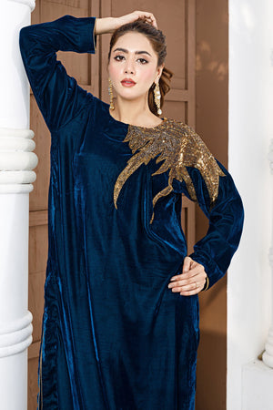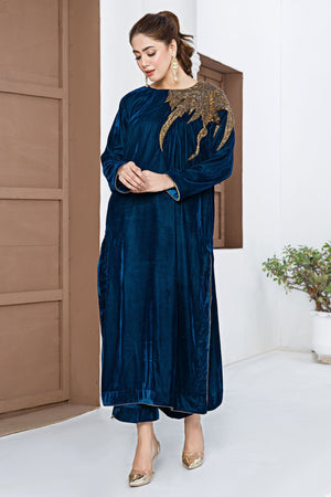 Look up with confidence in this teal velvet shirt intricately handworked along one side of the shoulder.