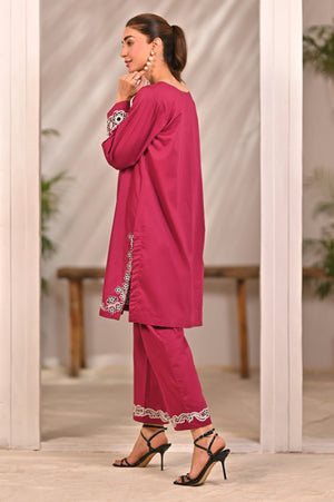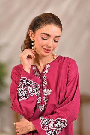 This article consists of a solid 2-piece set with an intricate embroidery detail touch on the shirt. The outfit consists of a long-length style shirt and fitted pants.