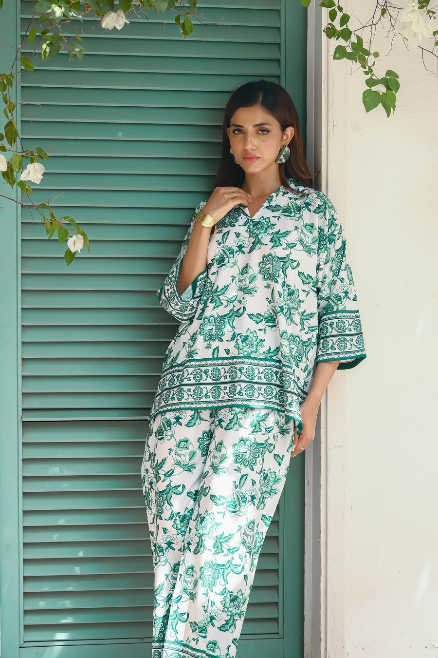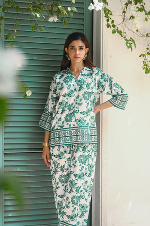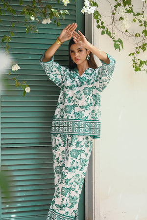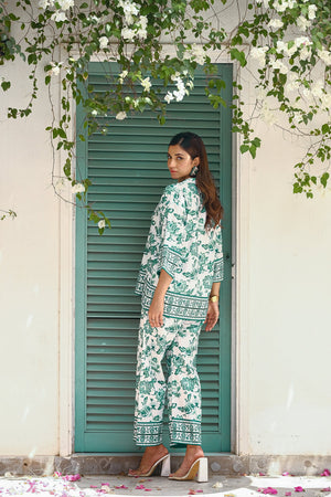 Introducing our "Hawaii" two-piece set, crafted from luxurious crepe material. This elegant ensemble features a long-sleeve shirt and matching trousers, both adorned with a fresh floral print in crisp white and vibrant green. The lightweight fabric ensures comfort and breathability, making it perfect for summer adventures. Whether you?re enjoying a sunny day at the beach or attending a garden party, the "Hawaii" set combines effortless style with sophistication, allowing you to embrace the season with a touch of floral elegance.