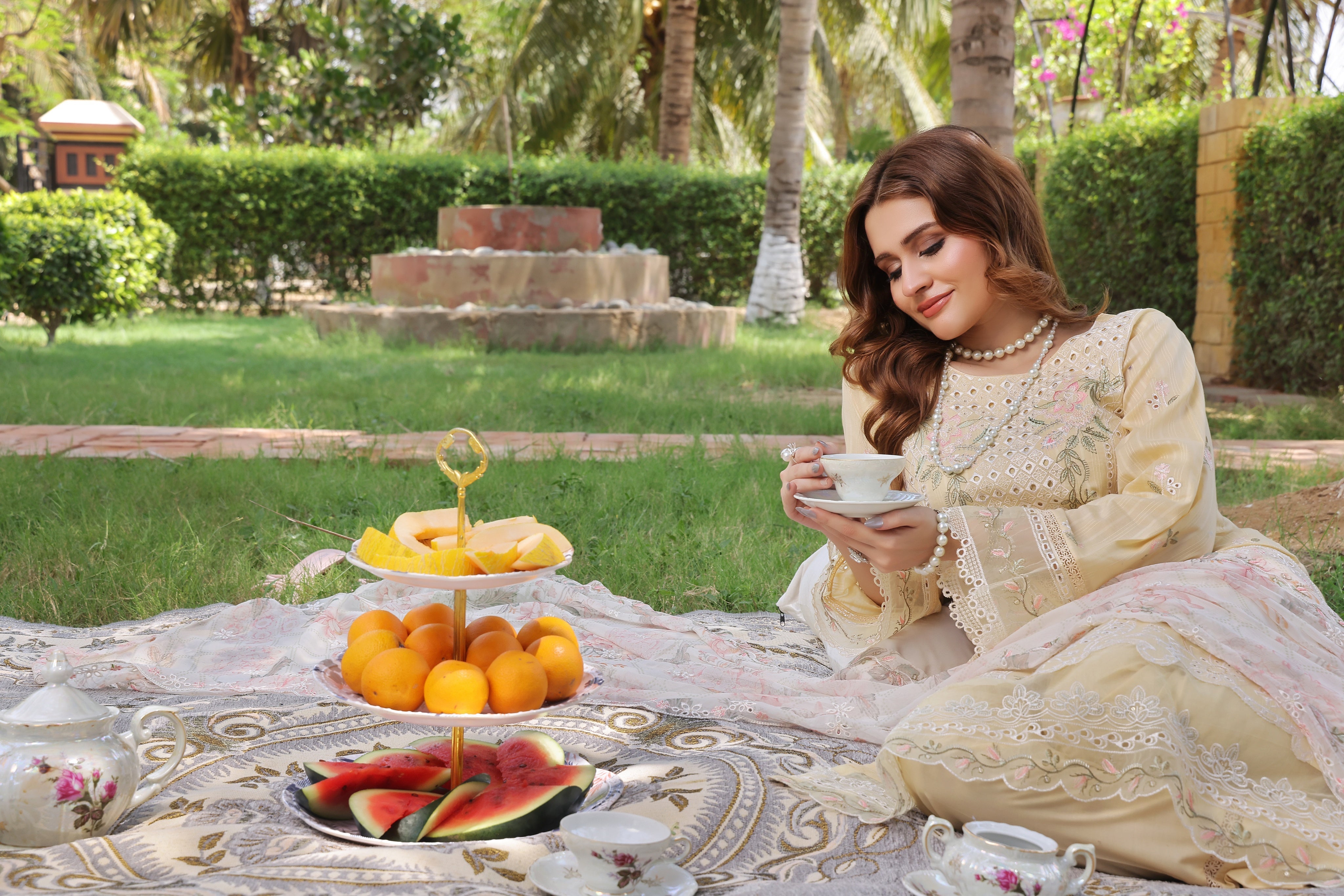 Cutwork Embroidered Chiffon with Digital Print – lightweight, detailed, and ready-to-wear elegance.