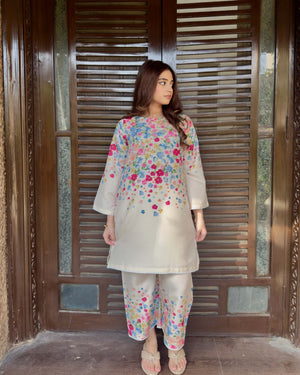 The outfit features a delicately crafted digital print shirt paired with chic culotte pants?perfect for warm weather and graceful daytime looks.
