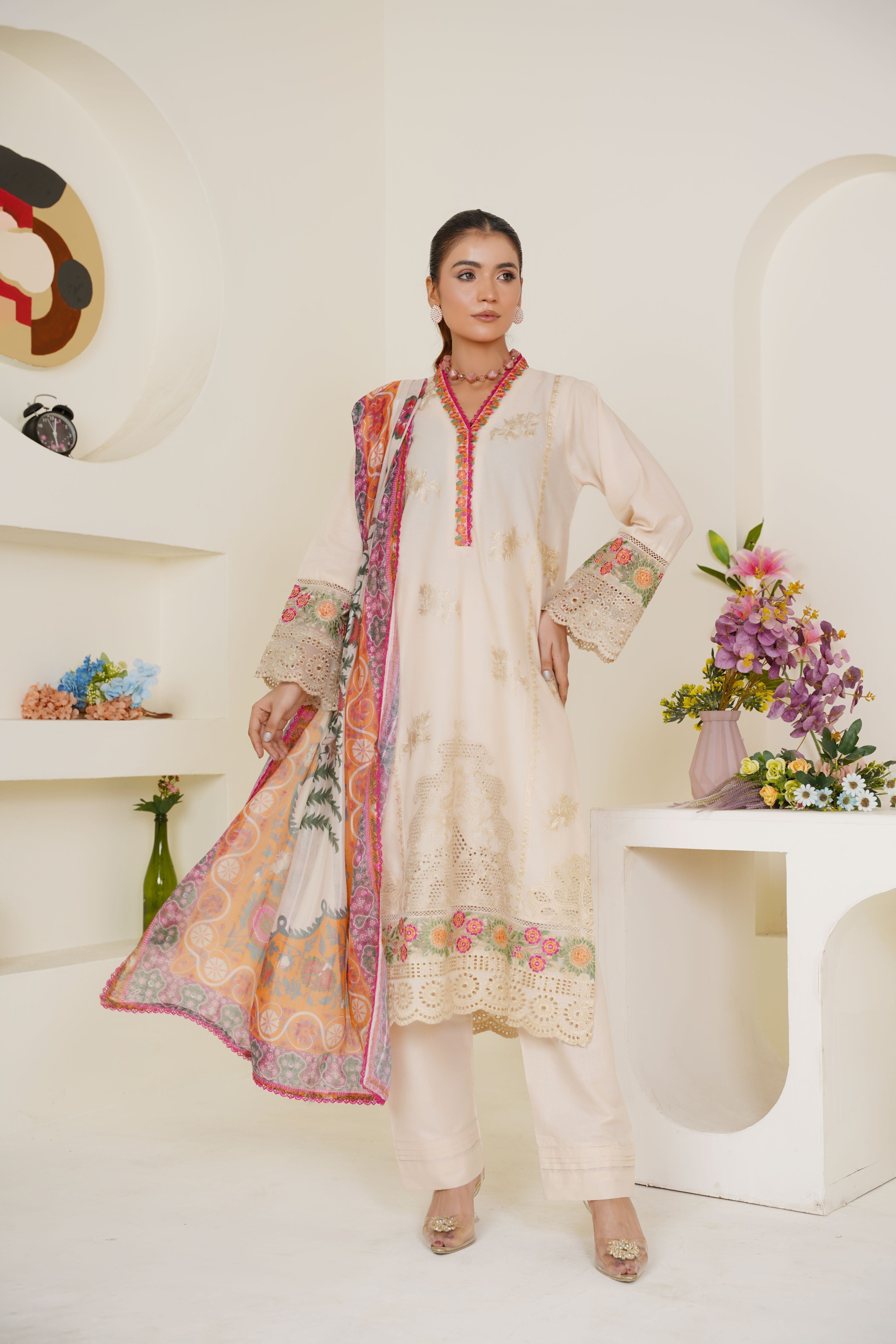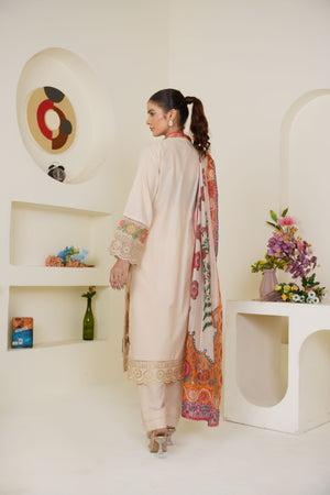 Threads & Weaves Ivory Cream Embroidered Lawn 3-Piece Pret Suit with Multicolor Dupatta