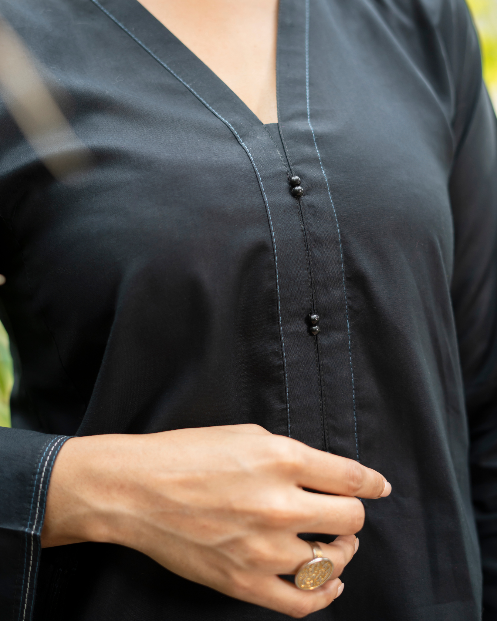Izhaar is a premium cotton black kameez and trouser set that empowers you to express your inner self with confidence. This elegant two-piece outfit is a bold statement in simplicity and self-expression