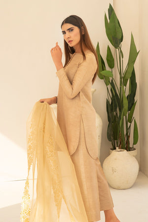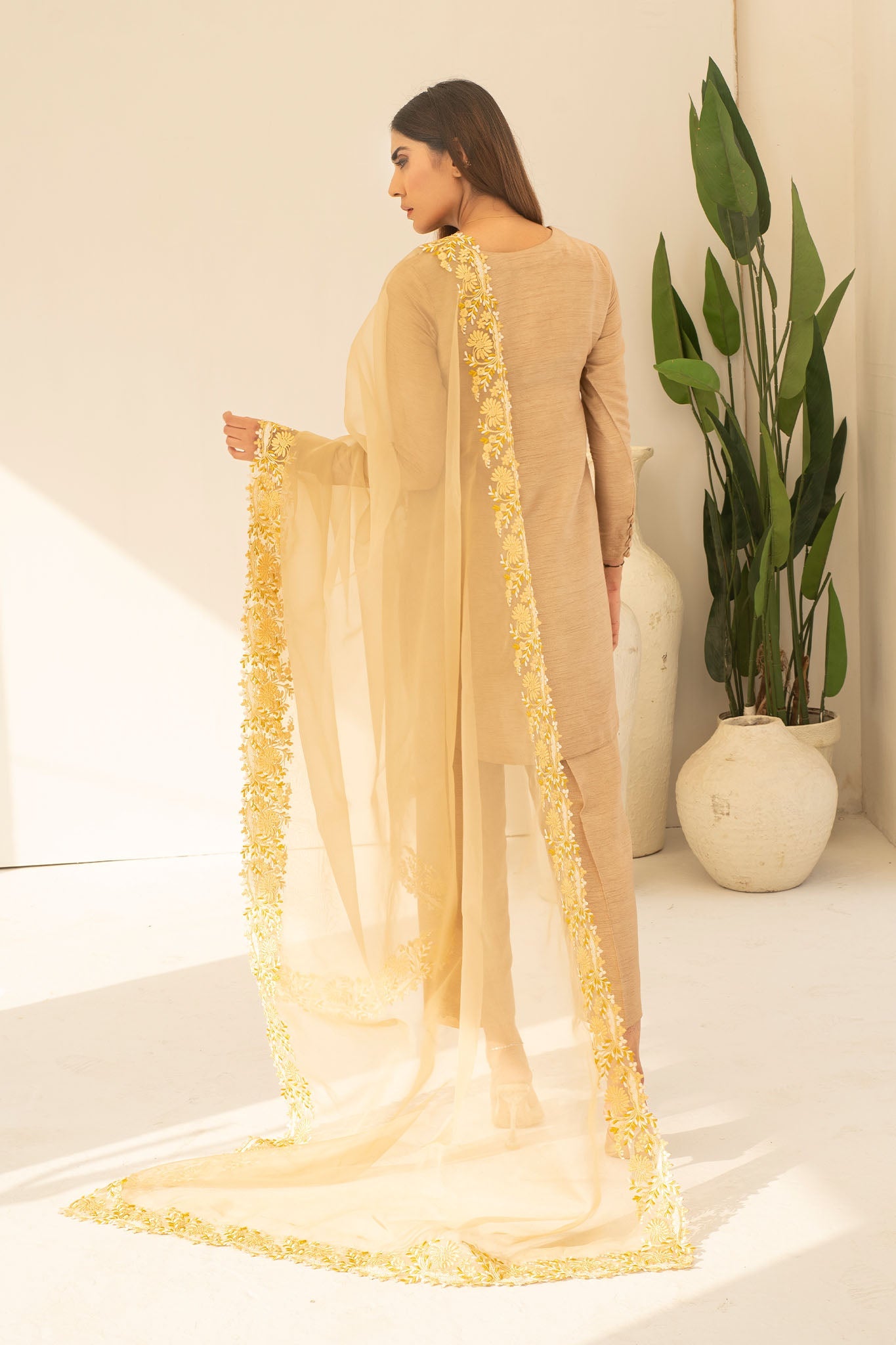 A stunning 3-piece set featuring a sophisticated raw silk shirt and trousers, paired with a beautifully embroidered organza dupatta. Elegant, timeless, and perfect for any special occasion.